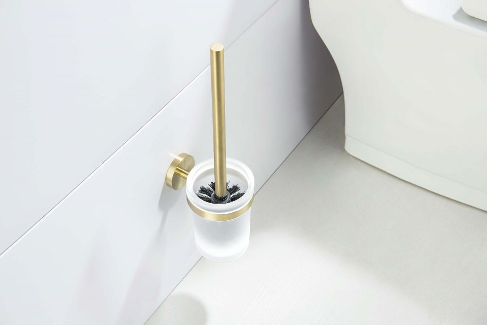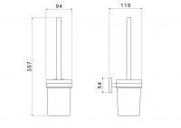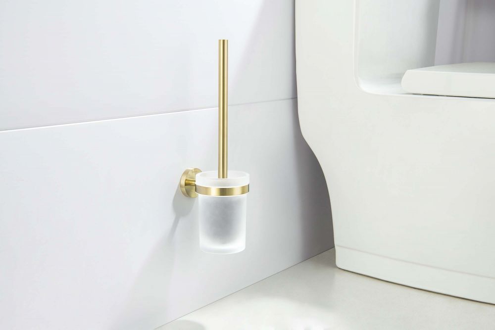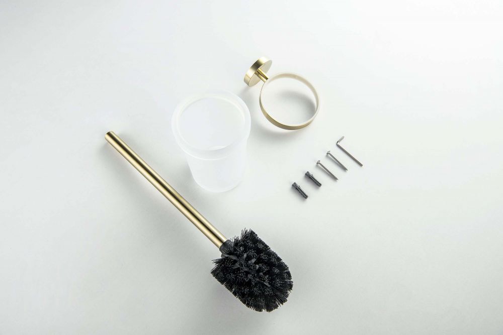 Материал - латунь Стакан из матового стекла Головка ершика из пластика, цвет черный Держатель из нержавейки Упаковано в белую коробку Размеры: 94*119*357мм