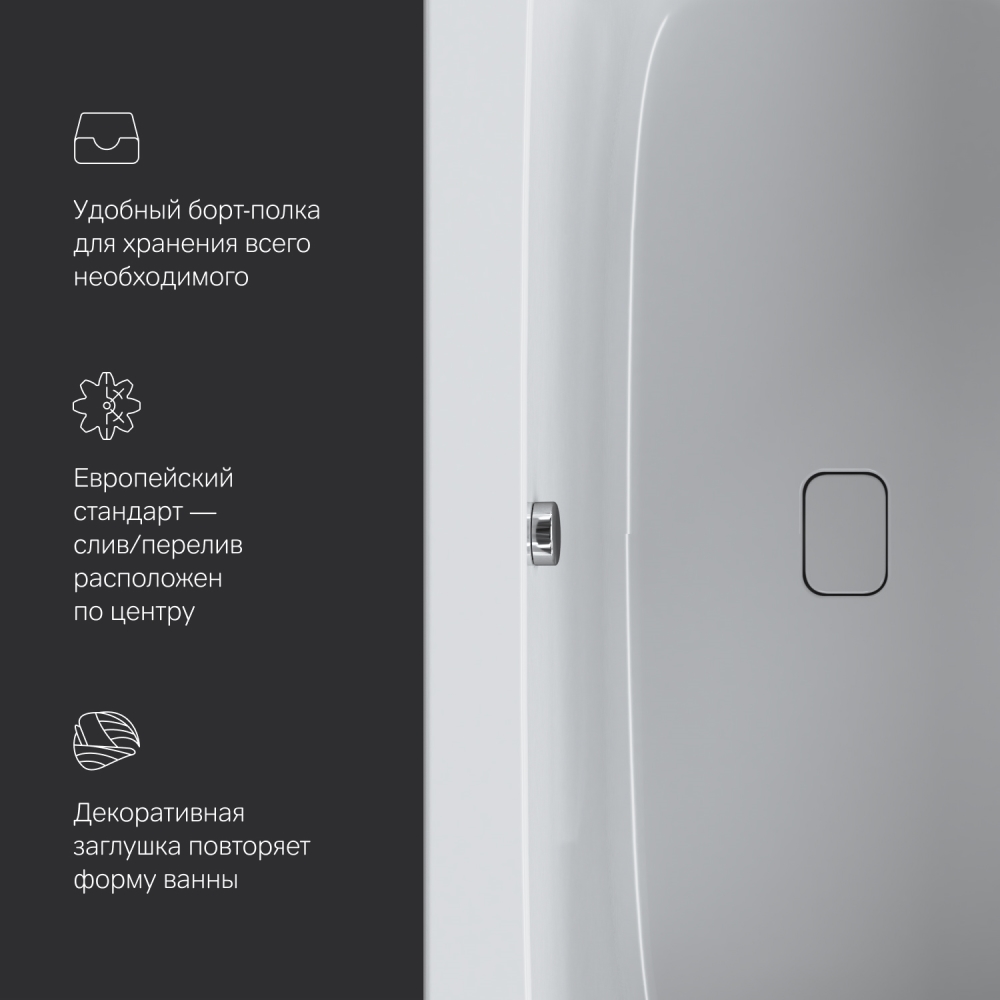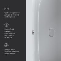 Коллекция Func — это не просто красивый внешний вид но и продуманные детали. Продукты Func создают стильное и комфортабельное пространство для жизни. Подчеркнутый оригинальный дизайн и практичная функциональность от дизайн-бюро DanelonMeroni (Великобритания / Италия). Широкий борт с одной стороны ванны добавляет дополнительное пространство для хранения. Теперь даже самое небольшое помещение может быть использовано оптимальным образом. Характерный дизайн: сочетание широкого борта с одной стороны с ультра-тонким бортом с другой стороны создает неповторимую квинтэссенцию стиля. А декоративная заглушка слива повторяющая форму самой ванны станет яркой деталью в интерьере. Разработанный совместно с ведущими терапевтами угол наклона спинки 125° обеспечивает оптимальную поддержку спины и максимальное погружение в воду. За счет низкой теплопроводности и теплоемкости акрила ванна поддерживает температуру набранной воды значительно дольше.