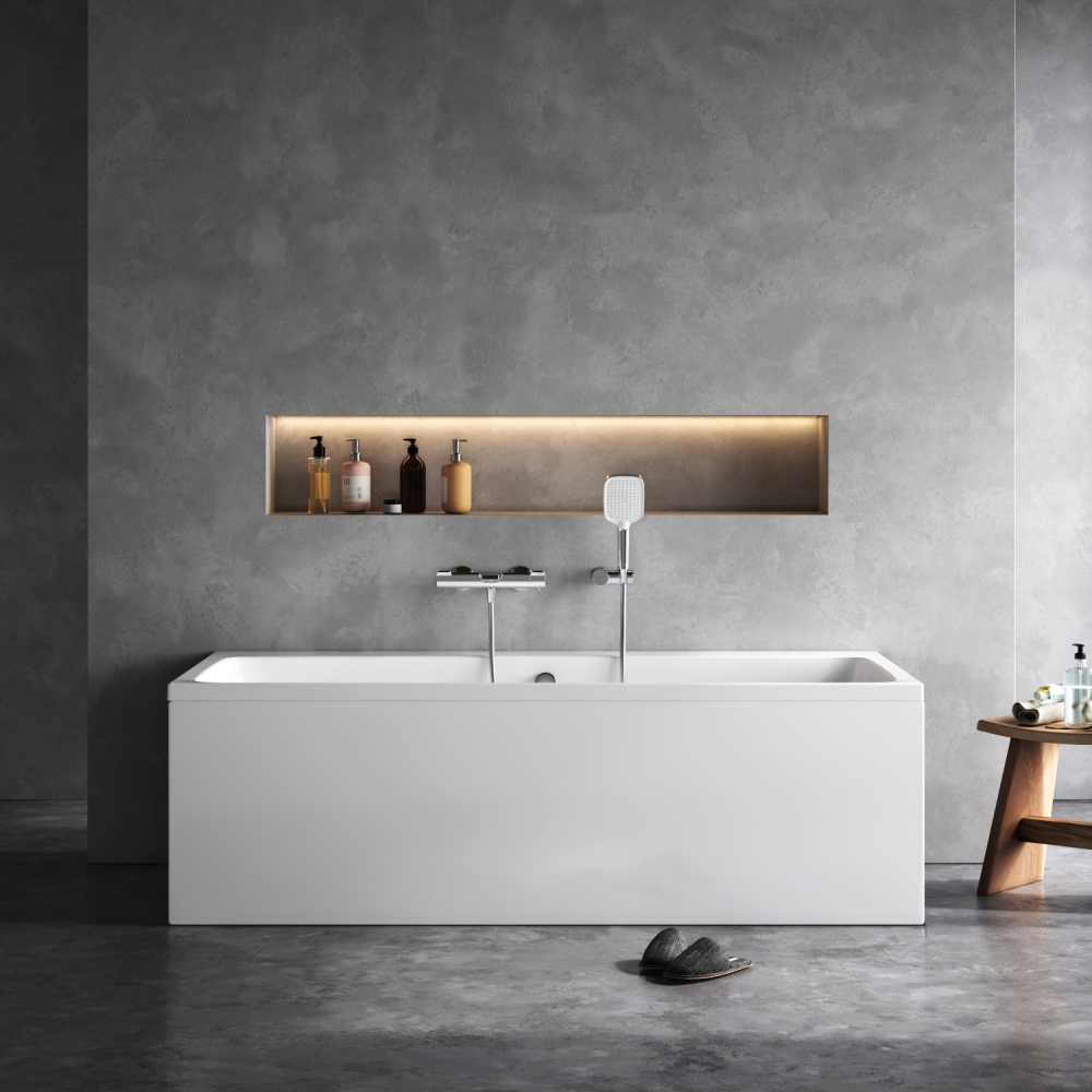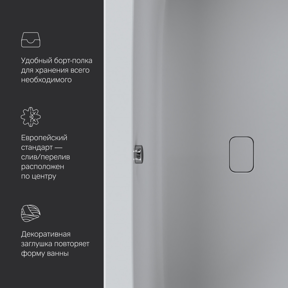 Коллекция Func — это не просто красивый внешний вид но и продуманные детали. Продукты Func создают стильное и комфортабельное пространство для жизни. Подчеркнутый оригинальный дизайн и практичная функциональность от дизайн-бюро DanelonMeroni (Великобритания / Италия). Широкий борт с одной стороны ванны добавляет дополнительное пространство для хранения. Теперь даже самое небольшое помещение может быть использовано оптимальным образом. Характерный дизайн: сочетание широкого борта с одной стороны с ультра-тонким бортом с другой стороны создает неповторимую квинтэссенцию стиля. А декоративная заглушка слива повторяющая форму самой ванны станет яркой деталью в интерьере. Разработанный совместно с ведущими терапевтами угол наклона спинки 125° обеспечивает оптимальную поддержку спины и максимальное погружение в воду. За счет низкой теплопроводности и теплоемкости акрила ванна поддерживает температуру набранной воды значительно дольше