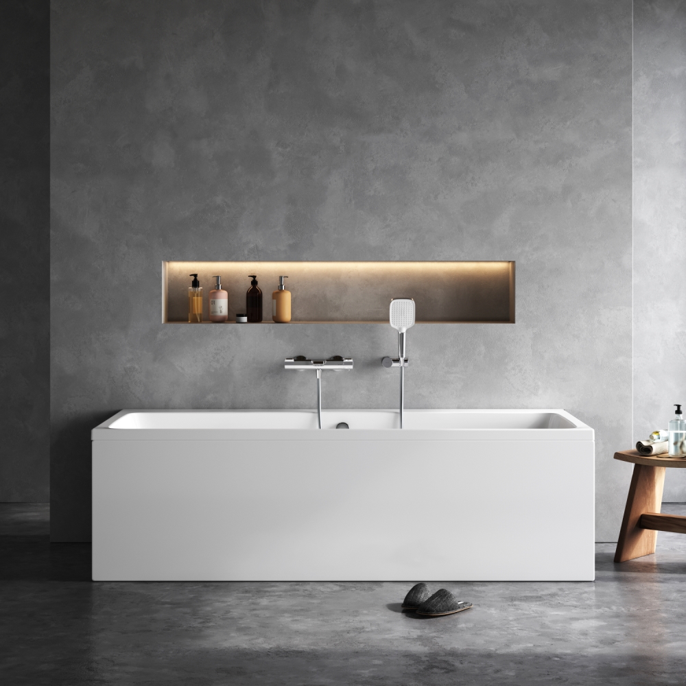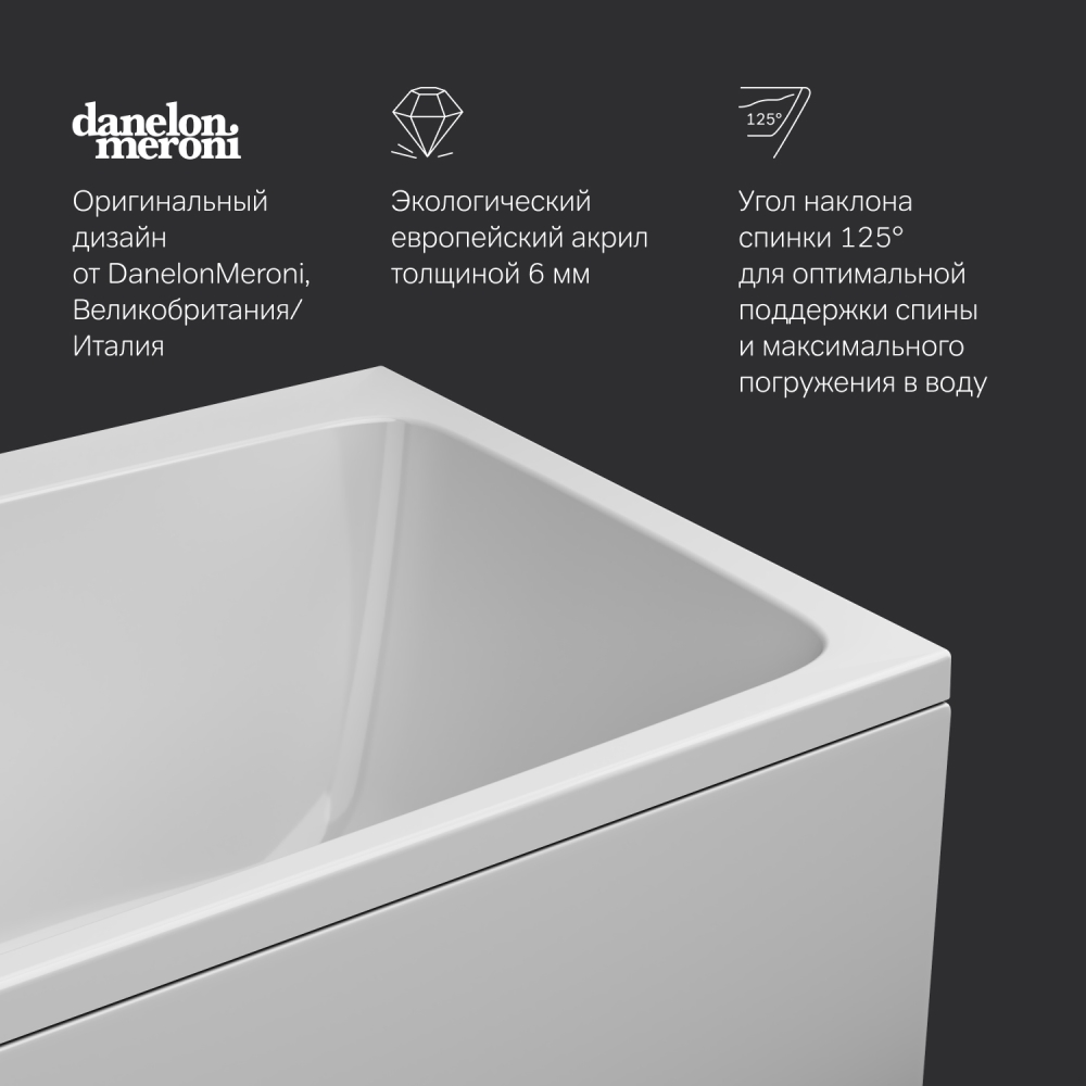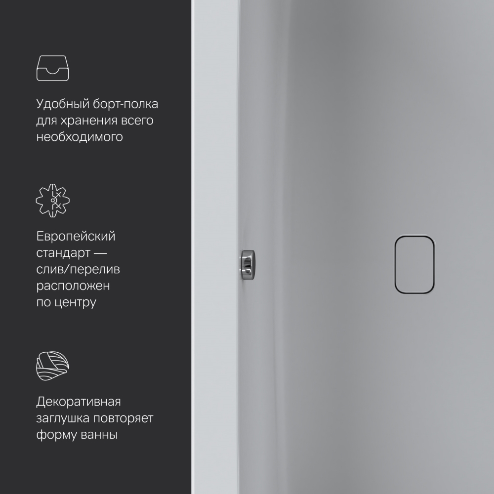 Коллекция Func — это не просто красивый внешний вид но и продуманные детали. Продукты Func создают стильное и комфортабельное пространство для жизни. Подчеркнутый оригинальный дизайн и практичная функциональность от дизайн-бюро DanelonMeroni (Великобритания / Италия). Широкий борт с одной стороны ванны добавляет дополнительное пространство для хранения. Теперь даже самое небольшое помещение может быть использовано оптимальным образом. Характерный дизайн: сочетание широкого борта с одной стороны с ультра-тонким бортом с другой стороны создает неповторимую квинтэссенцию стиля. А декоративная заглушка слива повторяющая форму самой ванны станет яркой деталью в интерьере. Разработанный совместно с ведущими терапевтами угол наклона спинки 125° обеспечивает оптимальную поддержку спины и максимальное погружение в воду. За счет низкой теплопроводности и теплоемкости акрила ванна поддерживает температуру набранной воды значительно дольше.