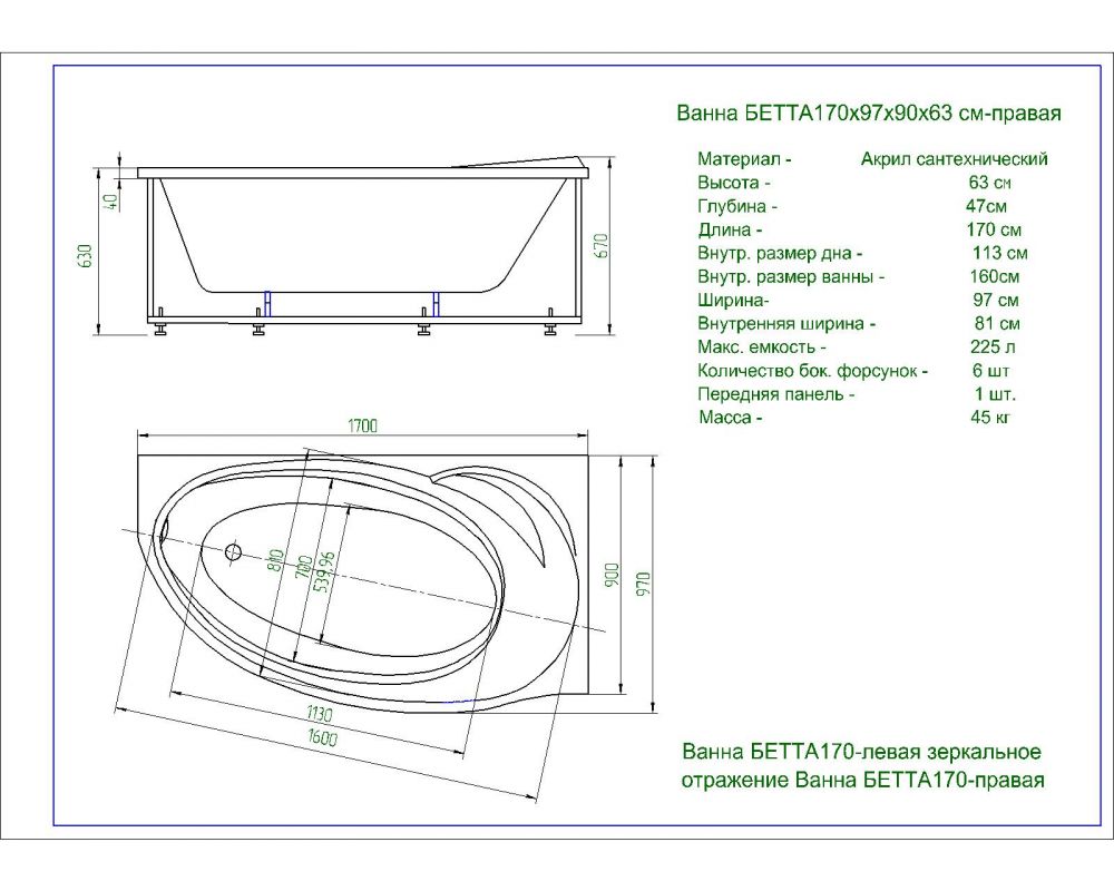 Акриловая ванна Aquatek Бетта 170x97 правая, BET170-0000154