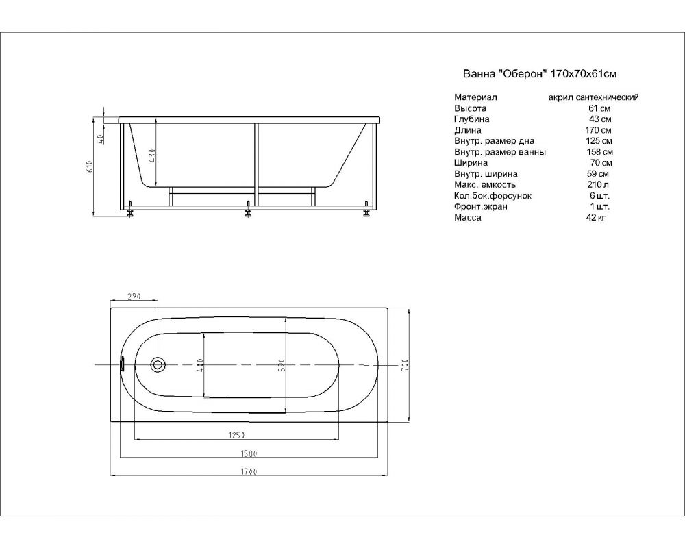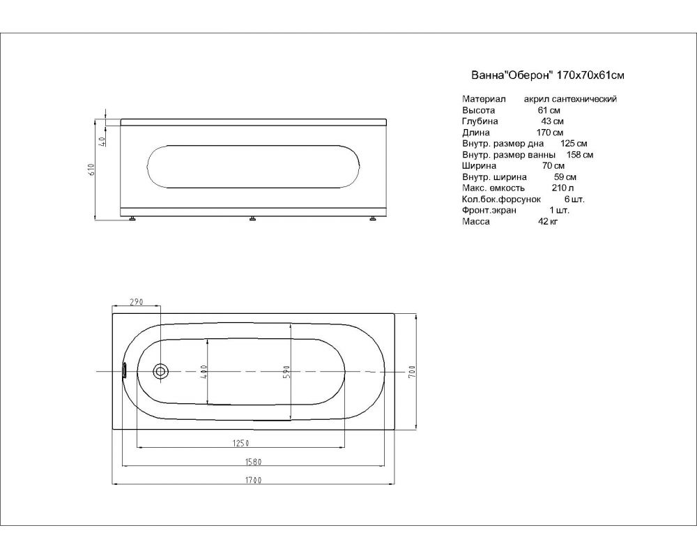 Акриловая ванна Aquatek Оберон 170x70 прямоугольная, OBR170-0000165
