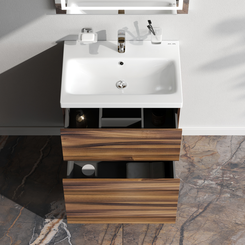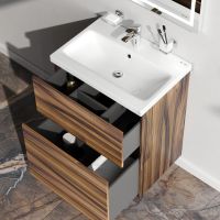 Мебель для ванной из коллекции Gem идеально подойдет тем кто предпочитает минимализм в интерьере и выбирает абсолютный комфорт. Представляем расширение цветовой палитры коллекции Gem в цвете “орех”. Напольная база под раковину изготовлена из влагостойкого ЛДСП. Внутреннее пространство двух вместительных ящиков представлено в цвете антрацит с антискользящим эффектом. В верхнем ящике находится удобный органайзер для хранения гигиенических принадлежностей. Благодаря системе отделений органайзера каждый предмет имеет свое место что обеспечивает порядок и удобство при использовании. Такая система хранения позволяет экономить место и помогает поддерживать чистоту ванной комнаты Фурнитура push-to-open - открытие ящика легким нажатием на фасад. Направляющие скрытого монтажа обеспечивают плавное выдвижение ящиков. Ширина базы под раковину - 60 см.