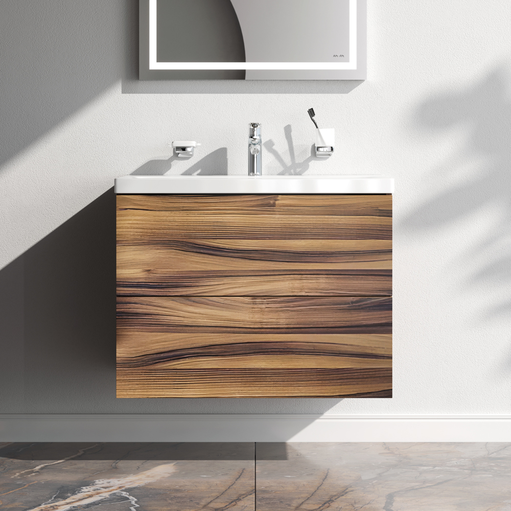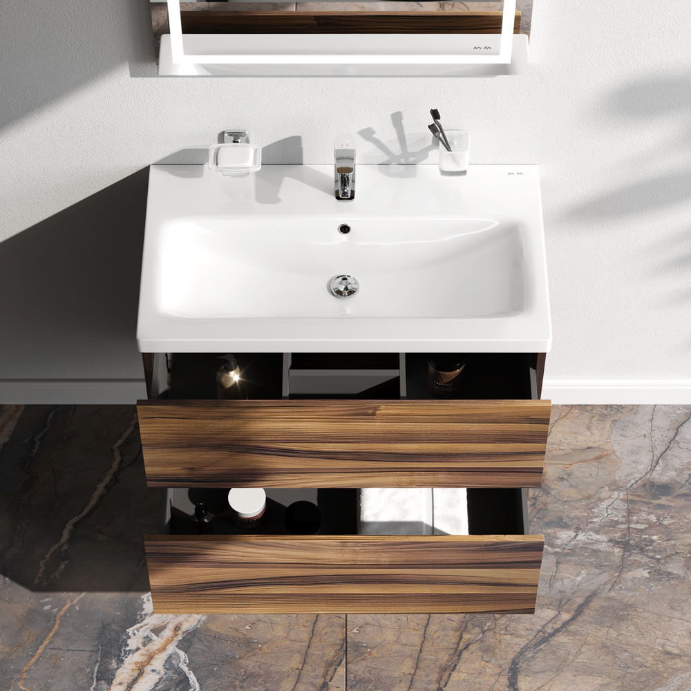 Подвесная мебель для ванной из коллекции Gem идеально подойдет тем кто предпочитает минимализм в интерьере и выбирает абсолютный комфорт. Представляем расширение цветовой палитры коллекции Gem в цвете “орех”. Подвесная база под раковину изготовлена из влагостойкого ЛДСП. Внутреннее пространство двух вместительных ящиков представлено в цвете антрацит с антискользящим эффектом. В верхнем ящике находится удобный органайзер для хранения гигиенических принадлежностей. Благодаря системе отделений органайзера каждый предмет имеет свое место что обеспечивает порядок и удобство при использовании. Такая система хранения позволяет экономить место и помогает поддерживать чистоту ванной комнаты. Фурнитура push-to-open - открытие ящика легким нажатием на фасад. Направляющие скрытого монтажа обеспечивают плавное выдвижение ящиков. Ширина базы под раковину - 75 см.