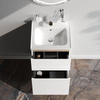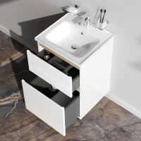 Напольная тумба бренда AM.PM коллекции X-Joy отличается эстетичным сочетанием цветов и фактур от дизайн-агентства Danelon Meroni: белые глянцевые фасады дополнены отделкой под светлое дерево. Функциональный органайзер в первом ящике позволит хранить необходимые косметические средства под рукой и в полном порядке. Внутреннее покрытие каждого ящика выполнено в современном цвете "антрацит" и имеет противоскользящее покрытие.​ Материал изделия - МДФ ЛДСП. Размер тумбы (Ш/Г/В): 475x445x830. Цвет тумбы - белый глянец. Экологически чистые и удивительно долговечные полиакриловые эмали – специальная технология покраски в 7 слоев превосходит технологию нанесения автоэмали у ведущих немецких марок и обеспечивает насыщенный цвет в течение всего срока службы (от 10 лет). Дополните тумбу раковиной коллекции X-Joy от европейского бюро Danelon Meroni (Великобритания/Италия). Чаша раковины создана с увеличенным объемом и элегантным бортиком по контуру. Раковина выполнена из белоснежного сантехнического фарфора. Размер раковины (Ш/Г/В): 490x450x172 мм. Цвет раковины - белый. Преимущества и функции: функционал хранения бытовой химии в тумбе с раковиной обеспечивает организованное и безопасное размещение моющих средств что способствует поддержанию порядка и упрощает доступ к необходимым материалам в процессе уборки. Оптимизация хранения вещей внутри ящиков. Грамотно расположенные скрытые коммуникации внутри тумбы. Устойчивая конструкция благодаря надежным ножкам. Бортик по контуру раковины и база под смеситель в виде острова предотвращают пролив воды за мебель. Материал раковины препятствует накоплению грязи и бактерий что облегчает чистку и поддержание гигиены. Гарантийные обязательства производителя: на раковину - 25 лет на тумбу - 3 года.