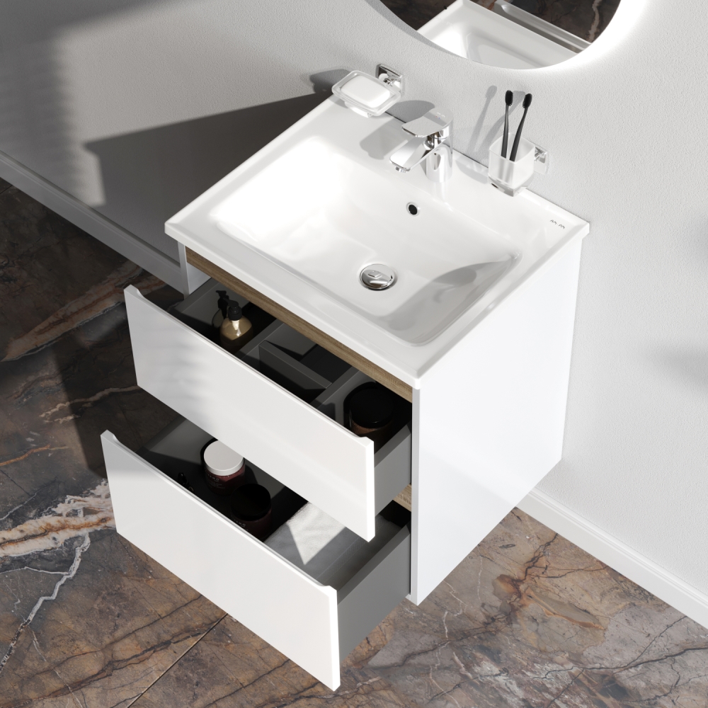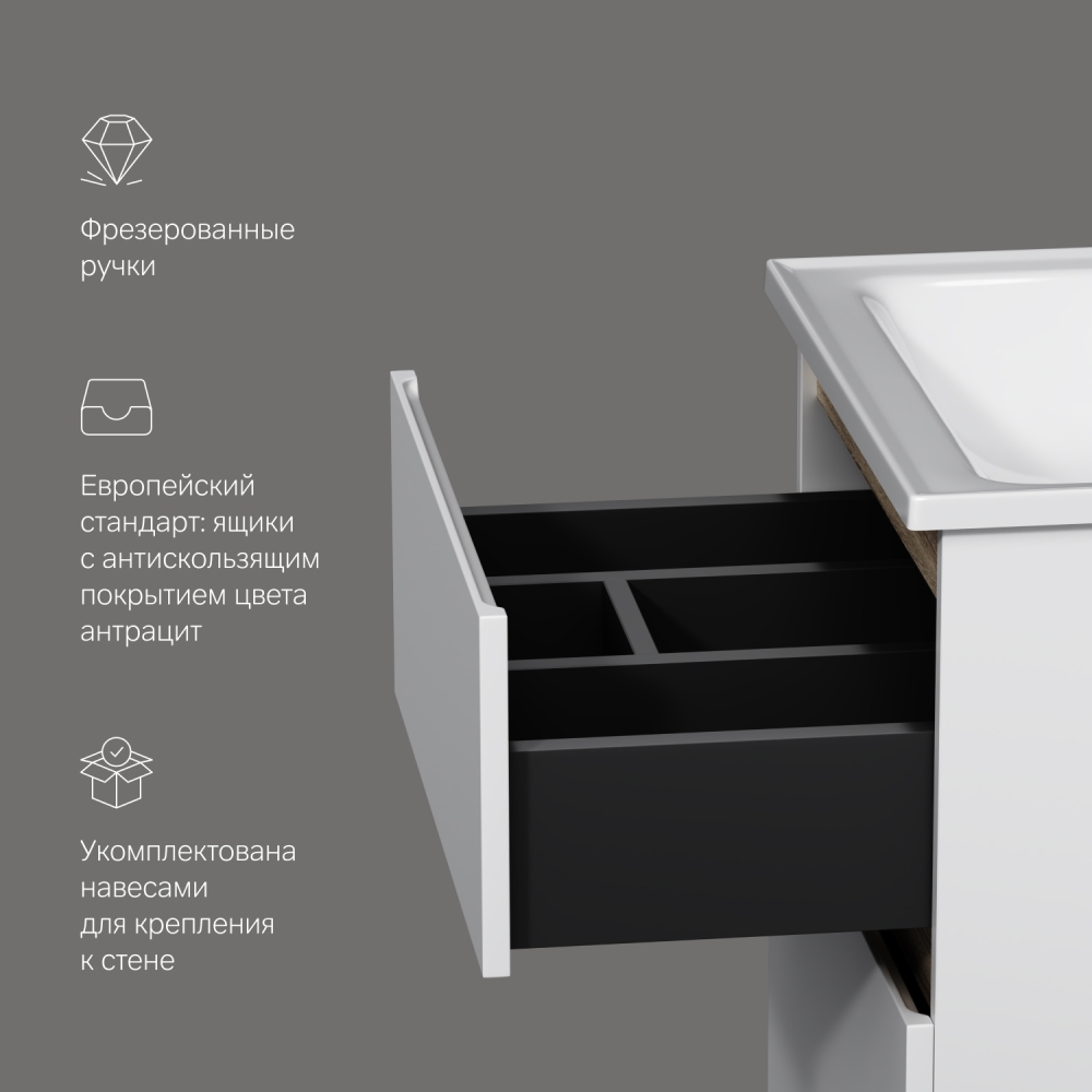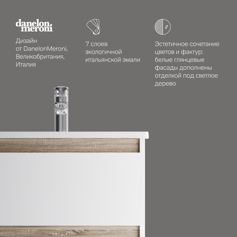 Впервые на рынке – дизайнерская коллекция сантехники которую может позволит себе каждый. Самое эстетичное сочетание цветов и фактур от дизайн-бюро Danelon Meroni (Великобритания & Италия): белые глянцевые фасады дополнены отделкой под светлое дерево. Функциональный органайзер в первом ящике позволит хранить необходимые косметические средства под рукой и в полном порядке. Внутреннее покрытие каждого ящика выполнено в современном цвете Anthracite и имеет противоскользящее покрытие.​ Встроенная керамическая раковина белоснежного цвета оснащена специальным бортиком для защиты от пролива воды за мебель. Экологически чистые и удивительно долговечные полиакриловые эмали – специальная технология покраски в 7 слоев превосходит технологию нанесения автоэмали у ведущих немецких марок и обеспечивает насыщенный цвет в течение всего срока службы (от 10 лет).
