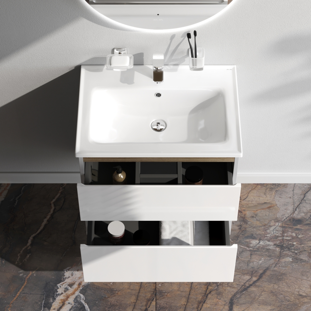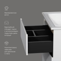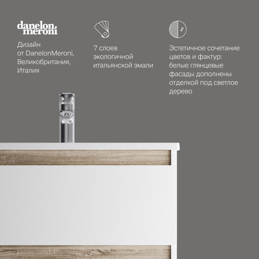 Впервые на рынке – дизайнерская коллекция сантехники которую может позволит себе каждый. Самое эстетичное сочетание цветов и фактур от дизайн-бюро Danelon Meroni (Великобритания & Италия): белые глянцевые фасады дополнены отделкой под светлое дерево. Функциональный органайзер в первом ящике позволит хранить необходимые косметические средства под рукой и в полном порядке. Внутреннее покрытие каждого ящика выполнено в современном цвете Anthracite и имеет противоскользящее покрытие.​ Встроенная керамическая раковина белоснежного цвета оснащена специальным бортиком для защиты от пролива воды за мебель. Экологически чистые и удивительно долговечные полиакриловые эмали – специальная технология покраски в 7 слоев превосходит технологию нанесения автоэмали у ведущих немецких марок и обеспечивает насыщенный цвет в течение всего срока службы (от 10 лет).
