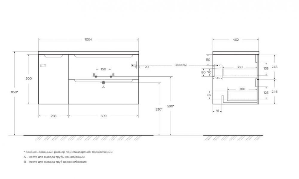 ETNA База под раковину подвесная с двумя выкатными ящиками и одной распашной дверцей, правосторонняя, Rovere Nature, 1004x462x500,ETNA-1000-2C-1A-SO-RN-R