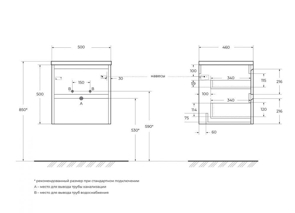 KRAFT База под раковину подвесная с двумя выкатными ящиками, Cemento Grigio, 500x460x500, KRAFT-500-2C-SO-CG