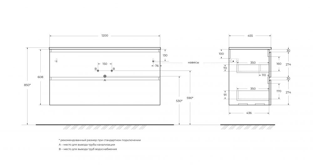 UNO База под раковину подвесная с фрезерованными ручками по всей длине фасада с двумя выкатными ящиками, Bianco Opaco, 1200x455x608, UNO-1200-2C-SO-BO