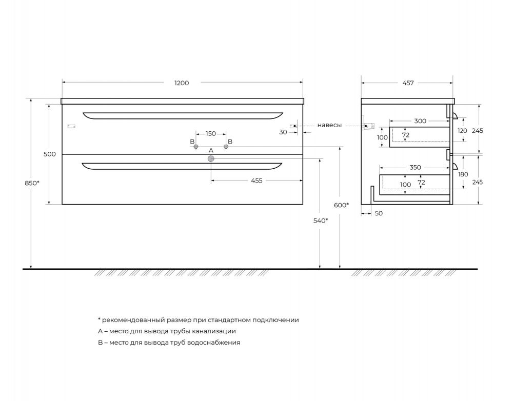 ECO-CER-N База под раковину подвесная с двумя выкатными ящиками, правосторонняя, Bianco Lucido, 1200x457x500, ECO-CER-N-1200-2C-SO-BL-R