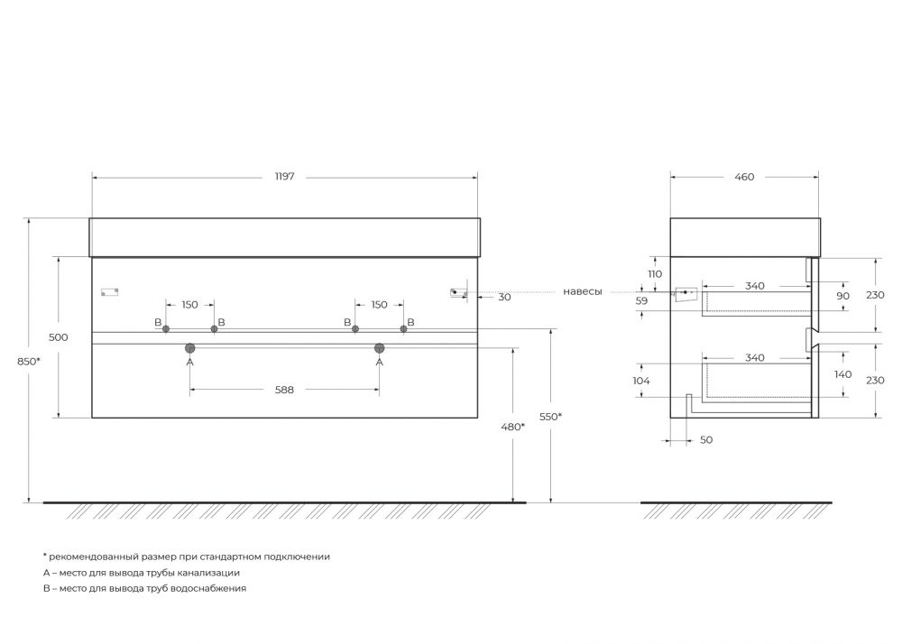 MOLVENO 46 База под раковину подвесная, под раковину с двумя чашами, с двумя выкатными ящиками, Nero, 1200x460x500, MOLVENO 46-120-2C-SO-2-NR