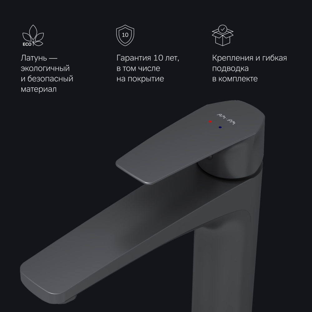 Гексагональные формы и современный европейский дизайн. Смеситель Gem оборудован специально спроектированным для AM.PM керамическим картриджем Soft Motion 35 мм который обеспечивает оптимальную регулировку температуры а также позволяет выдерживать любые перепады давления. Широкая амплитуда ручки позволяет настраивать точно ту температуру которая комфортна именно вам. Аэратор насыщает воду кислородом экономя ресурс и предотвращая разбрызгивание. Забота о безопасности: изготовлен из экологичной и безопасной латуни с пониженным содержанием свинца.