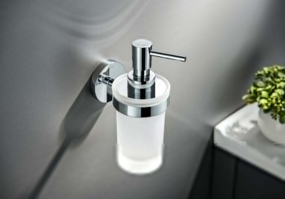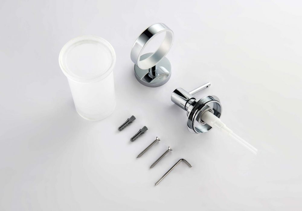 Материал - латунь Стакан из матового стекла Головка дозатора из цинкового сплава Держатель из нержавейки Упаковано в белую коробку Размеры: 69*111*163мм