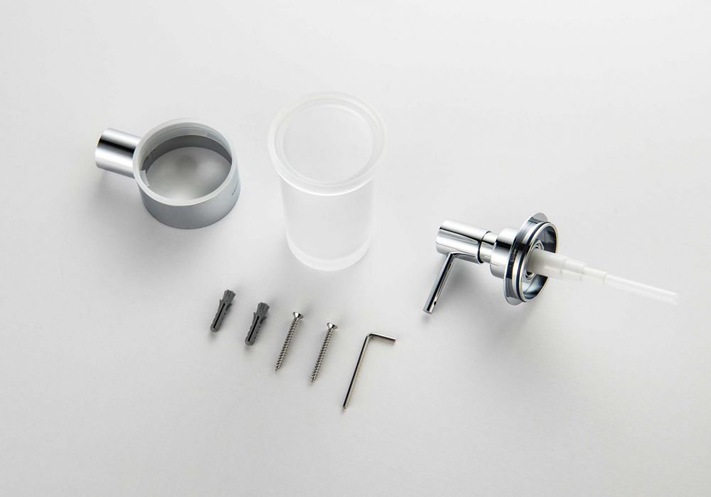 Материал - нержавейка Стакан из матового стекла Головка дозатора из цинкового сплава Держатель из латуни Упаковано в белую коробку Размер: 69*111*163мм