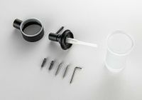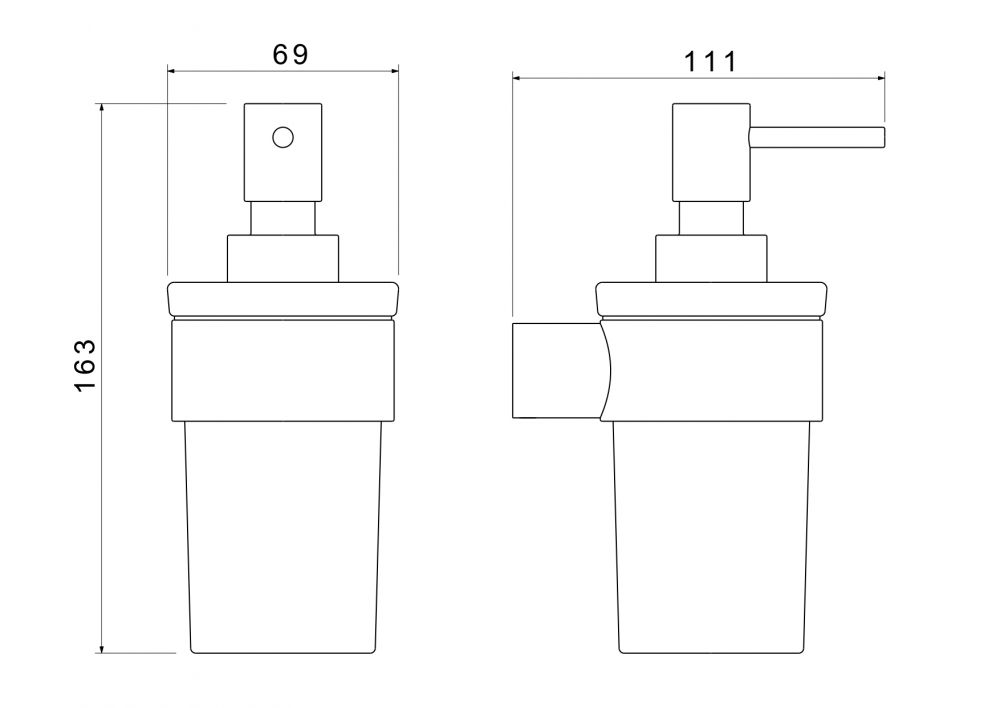 Материал - нержавейка Стакан из матового стекла Головка дозатора из цинкового сплава Держатель из латуни Упаковано в белую коробку Размер: 69*111*163мм