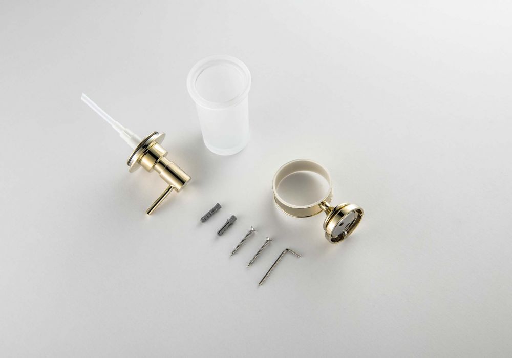 Материал - латунь Стакан из матового стекла Головка дозатора из цинкового сплава Держатель из латуни Упаковано в белую коробку Размеры: 121*69*163мм