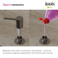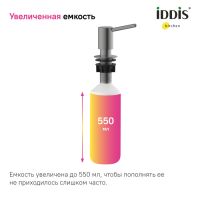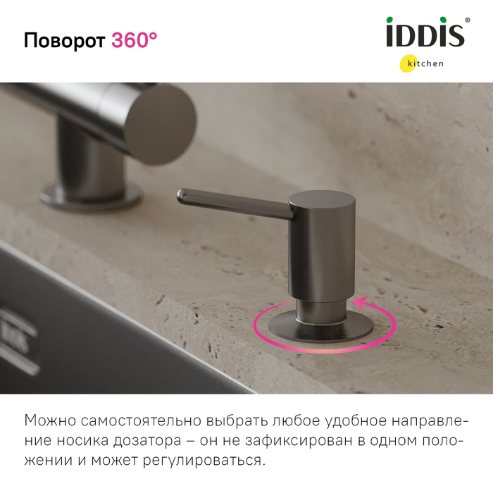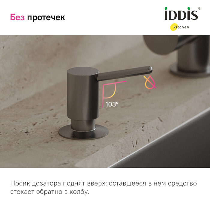Встраиваемый в столешницу дозатор – незаменимый аксессуар для кухни, где ничто не должно отвлекать от красивого интерьера. Выглядит эстетично и занимает минимум места, освобождая его для действительно важных вещей. Трендовый цвет и универсальный дизайн сочетаются со смесителями и мойками IDDIS® и других производителей в тон. Отверстие для установки – 29-37 мм. • Прослужит долго: за счет надежного механизма-помпы, носика и насоса из латуни. • Легко наполнять – верхняя часть дозатора снимается без резьбы и удерживается уплотнительным кольцом. • Вместительная емкость 550 мл – не нужно часто доливать. • Долговечное покрытие, устойчивое к царапинам и бытовой химии. • Не подтекает – носик поднят вверх, оставшееся средство стекает обратно в колбу. Отверстие на носике снизу выглядит более эстетично. • Продуманная конструкция не собирает грязь – мало труднодоступных мест и лишних стыков, где она может скопиться. Гарантия на кухонные аксессуары IDDIS® – 2 года. (с) Авторский текст, декабрь 2023 г.