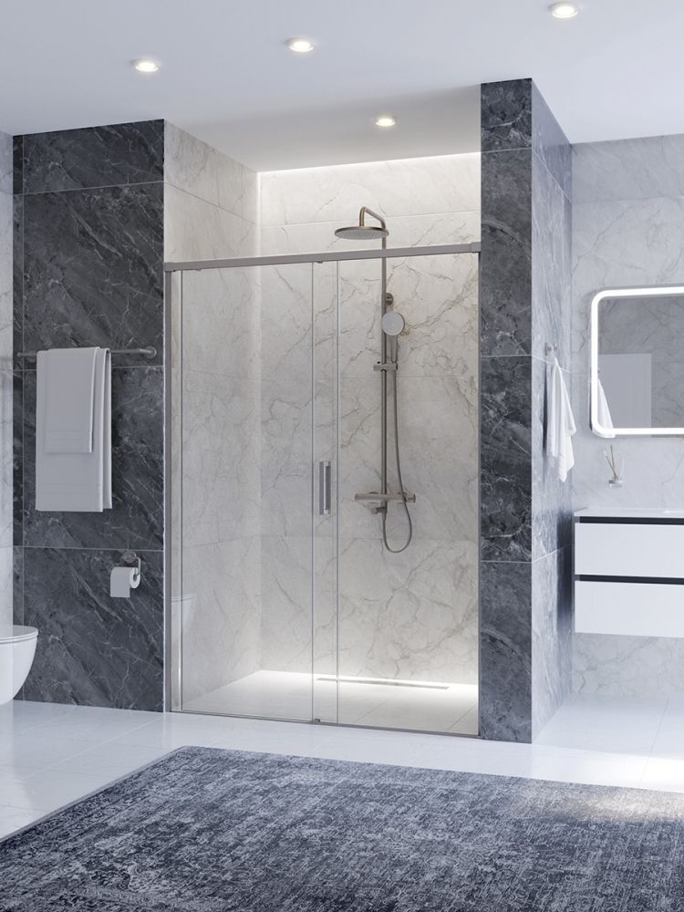 PLANE-BF-1-130-C-IN Душевая дверь, отделка Сатин без поддона, шириной 130 см. Прозрачное стекло толщиной 6мм