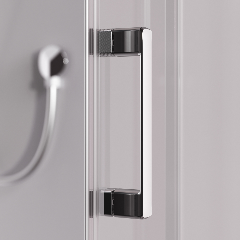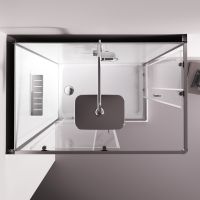 Душевая кабина без крыши с тропическим верхним душем. Держателем ручного душа регулируемого по высоте удобная съёмная полка с крючками отсутствует угловая колонна что увеличивает внутренне пространство внутри кабины стильные ручки с паттерном и модные коннекторы с логотипом AM.PM. Ультратонкие профили создающие невесомость конструкции кабины.