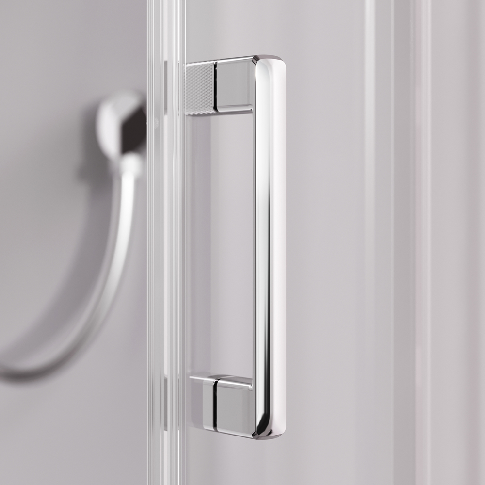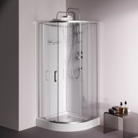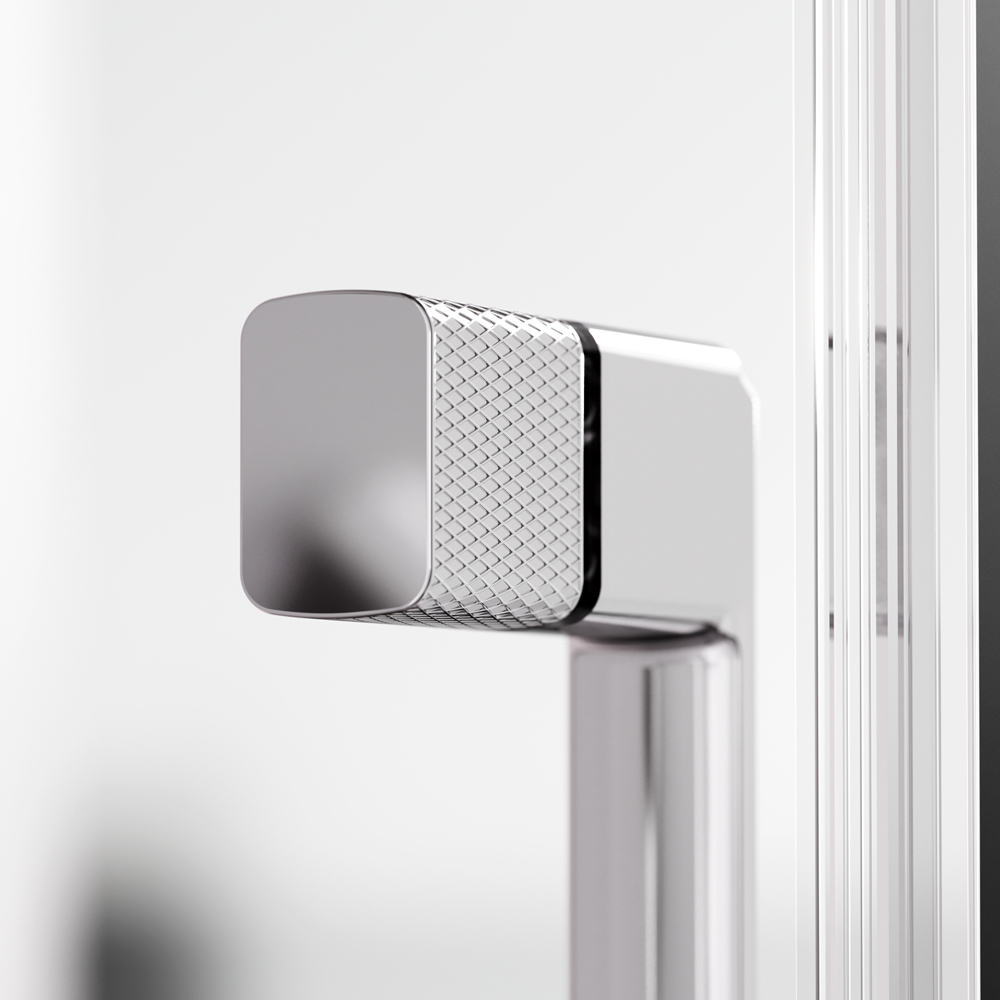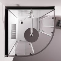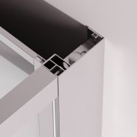 Душевая кабина без крыши с тропическим верхним душем. Держателем ручного душа регулируемого по высоте удобная съёмная полка с крючками отсутствует угловая колонна что увеличивает внутренне пространство внутри кабины стильные ручки с паттерном. Ультратонкие профили создающие невесомость конструкции кабины.