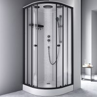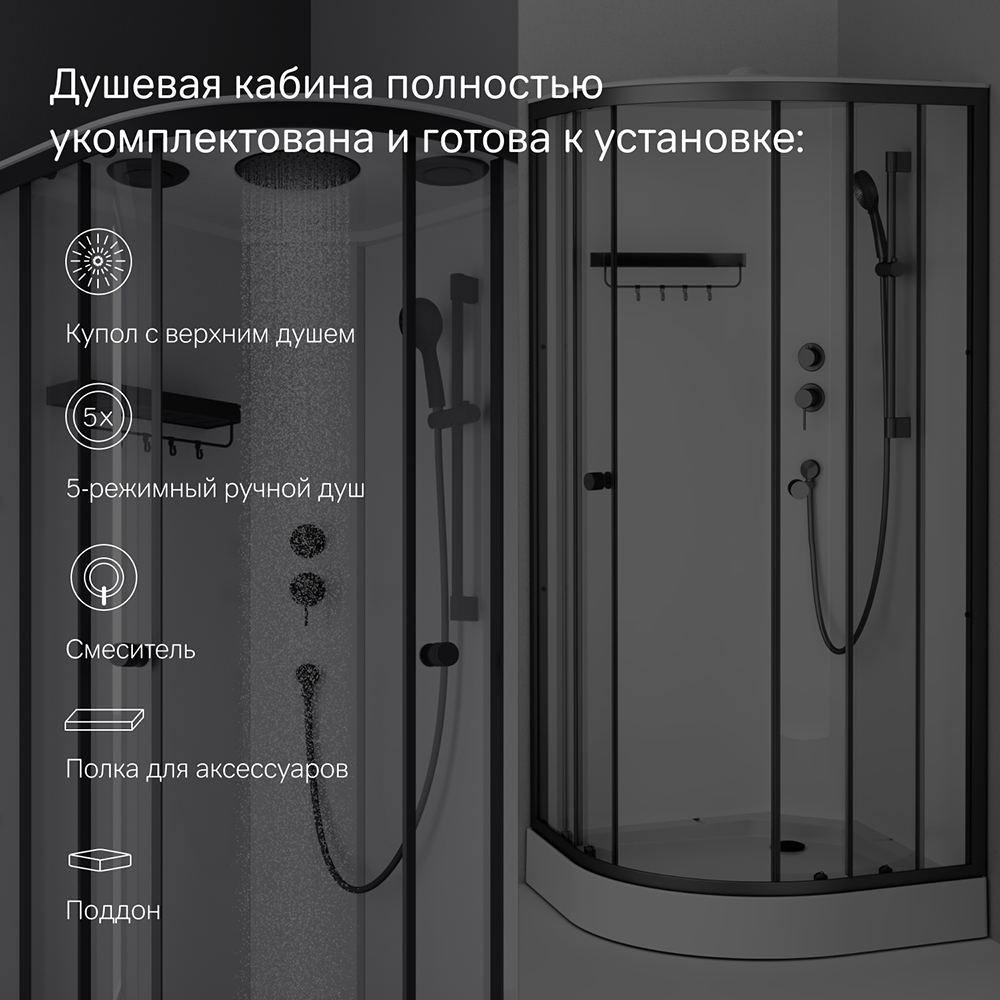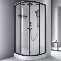 Одинарные ролики обеспечивают легкое и бесшумное открывание. Кабина оснащена 5-режимным ручным душем, стильным смесителем и компактной полкой, на которой разместится все необходимое. Герметичная конструкция защищает помещение от брызг воды.