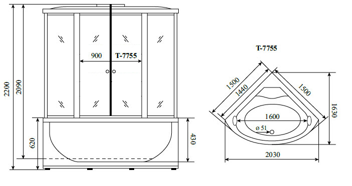 Душевая кабина Timo T-7755 150x150 высокий поддон, исполнение универсальное, передение стенки прозрачное стекло, профиль в цвете хром