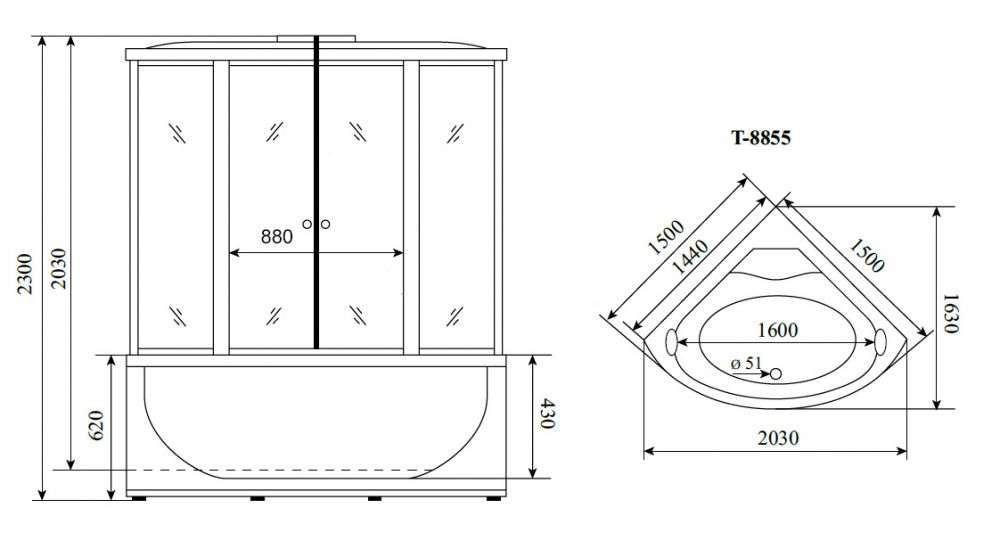 Душевая кабина Timo T-8855F 150x150 высокий поддон, исполнение универсальное, передение стенки матовые стекло, профиль в цвете хром