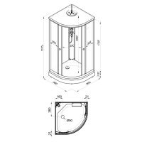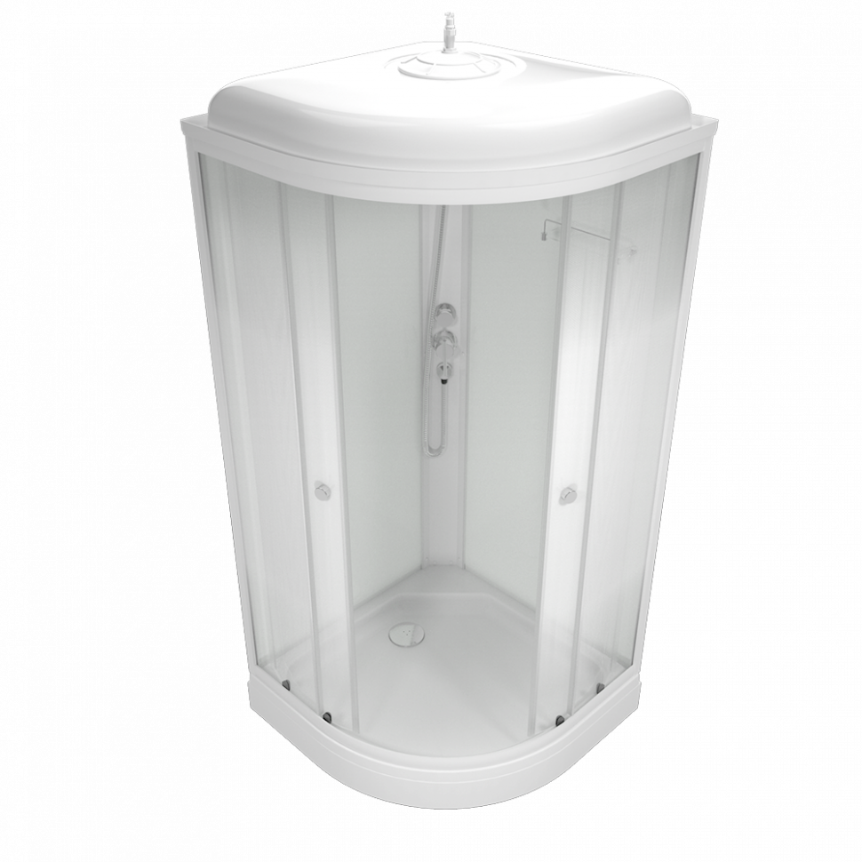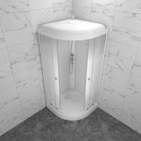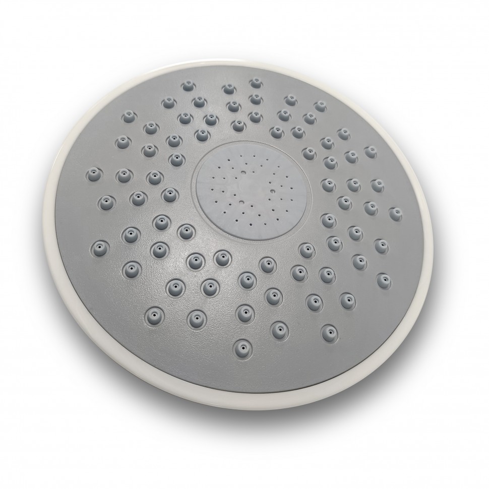 Поддон из белого акрила, бортики не высокие. Имеет душ в виде лейки, тропический душ в крыше, полочку для ванных принадлежностей.