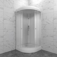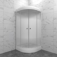 Душевая кабина имеет стенки полупрозрачного цвета, а также створки на роликах, выполненные из каленого ударопрочного стекла, дополены стильными ручками.