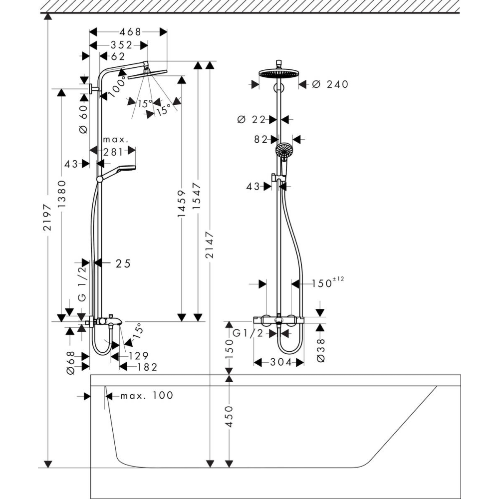 Характеристики: - состоит из: верхний душ, ручной душ, термостат для ванны, штанга для душа, держатель для душа; - угол наклона может изменяться до 45° - верхний душ Crometta S 240; - размер душевого диска: 240 мм; - шарнирное соединение: регулируемый угол верхнего душа; - тип струи: Rain; - расход воды для струи Rain (при 3 бар): 17 л/мин; - рабочее давление: мин. 1,5 бар/макс. 10 бар; - длина держателя для душа: 350 мм; - термостат Ecostat Comfort; - расход воды для излива на ванну: 20 л/мин; - предохранительный ограничитель при 40°C; - регулируемый ограничитель температуры горячей воды; - пользовательское управление посредством вращения рукоятки; - вид монтажа: внешний монтаж; - величина соединения DN15; - соединительная резьба G ½- ;; - межосевое подключение 150 мм ± 12 мм; - держатель для ручного душа регулируемый по высоте; - подъемная труба может быть укорочена по высоте.