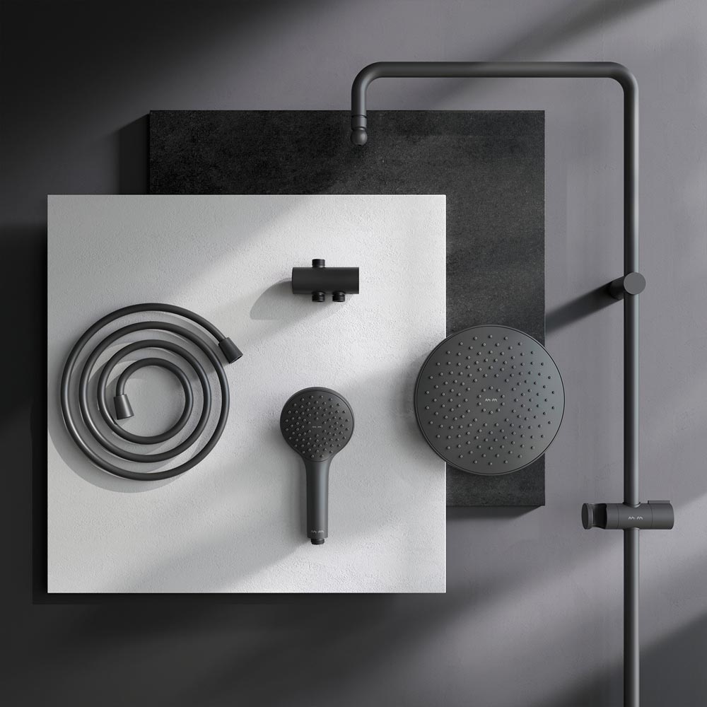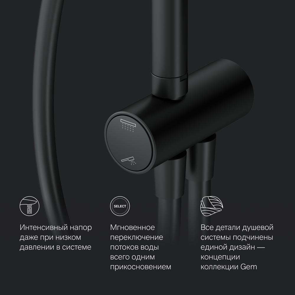 Тотальный дизайн в действии: все детали душевой системы – от пропорций ручного и верхнего душей до рисунка расположения форсунок на лейках – подчинены единой дизайн-концепции коллекции Gem.