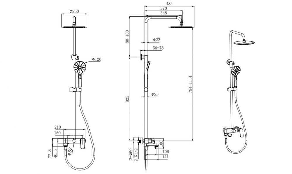 AQ2040BGM ВЕГА душевая система (смеситель для ванны) 3jet 250мм, оружейная сталь