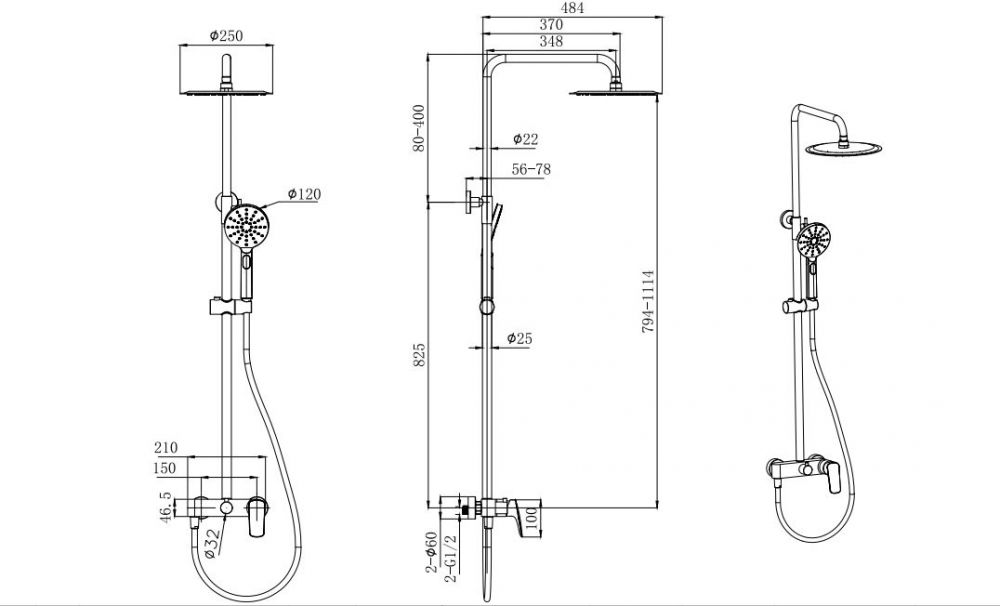 AQ2060BGM ВЕГА душевая система (смеситель для душа) 3jet 250мм, оружейная сталь