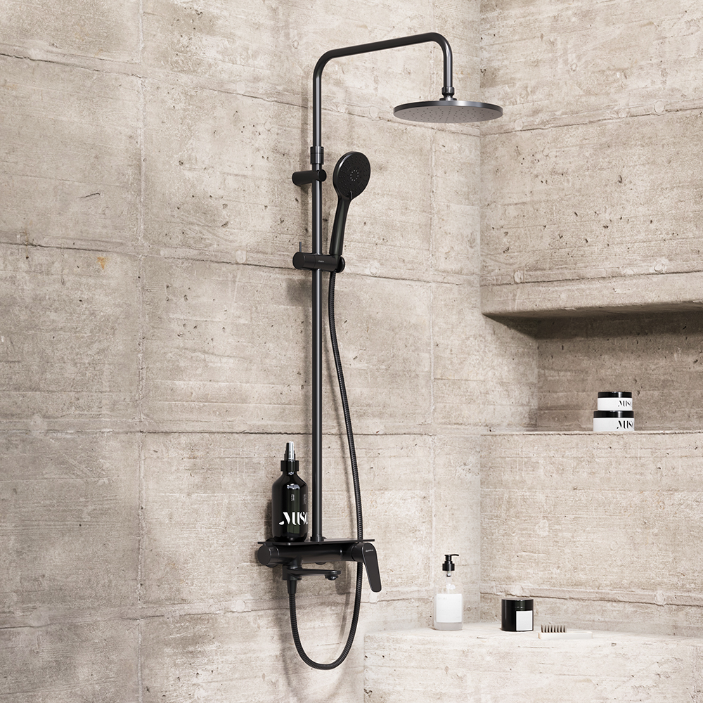 Глубокий матовый цвет дополнен покрытием High Gloss, которое уберегает поверхность душевой системы от мелких повреждений. Приятно удивит многофункциональная полочка, встроенная в смеситель для хранения нужных средств для ухода.