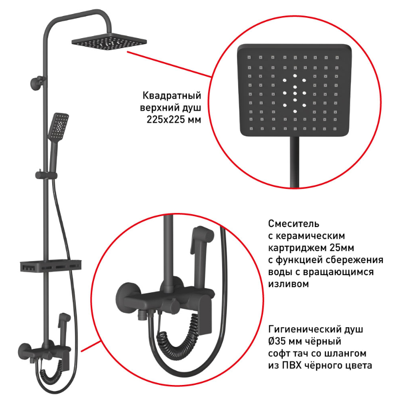 • Верхний душ квадратный 225х225мм осуществляет мягкий массажный эффект.