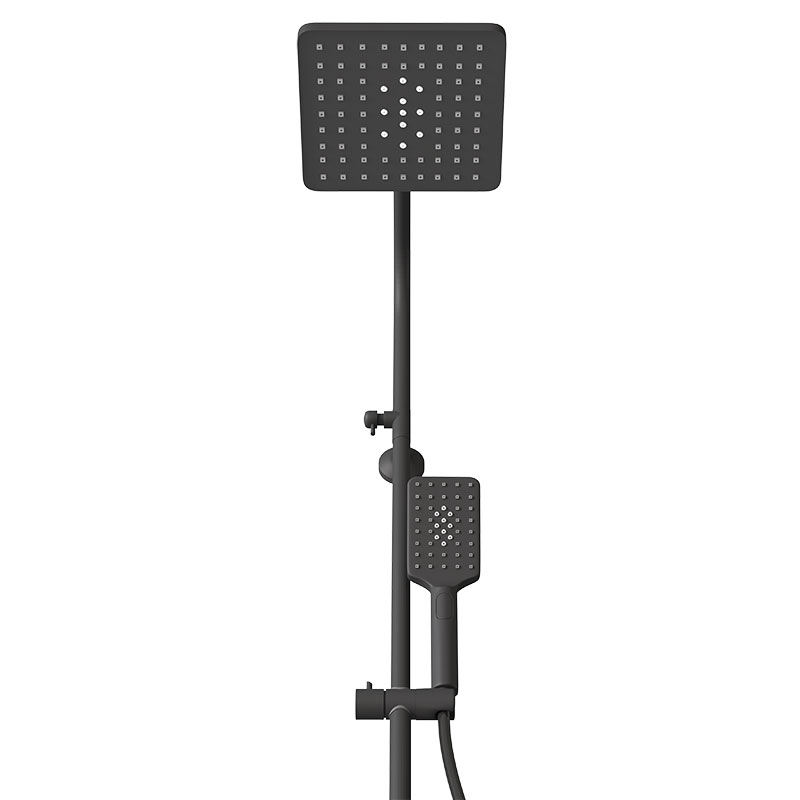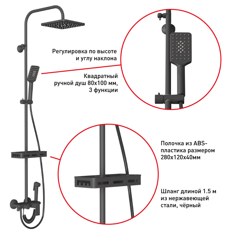 • Ручной душ квадратный 80х110мм 3-функциональный, также имеет по центру форсунки-рассекатели, подсоединён к шланги чёрного цвета из нержавеющей стали.