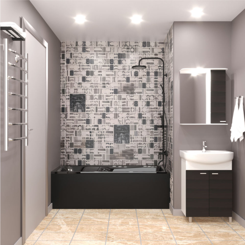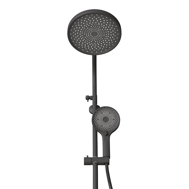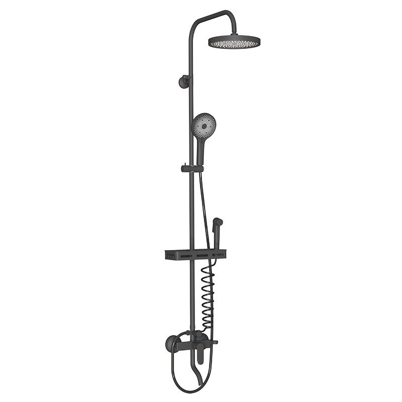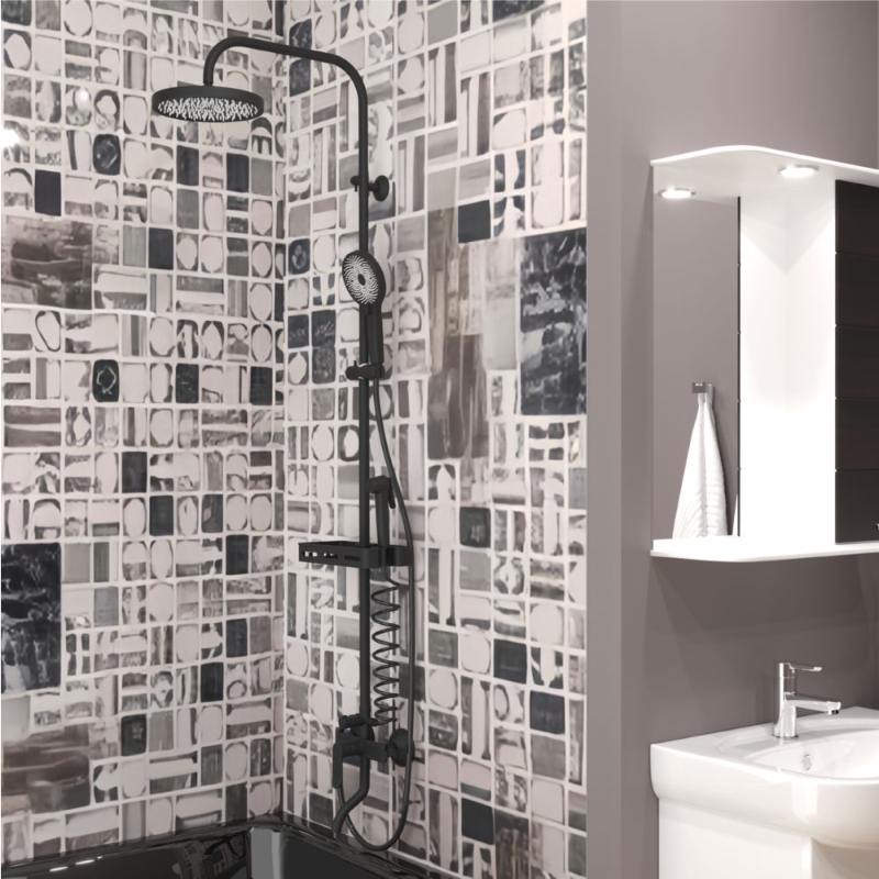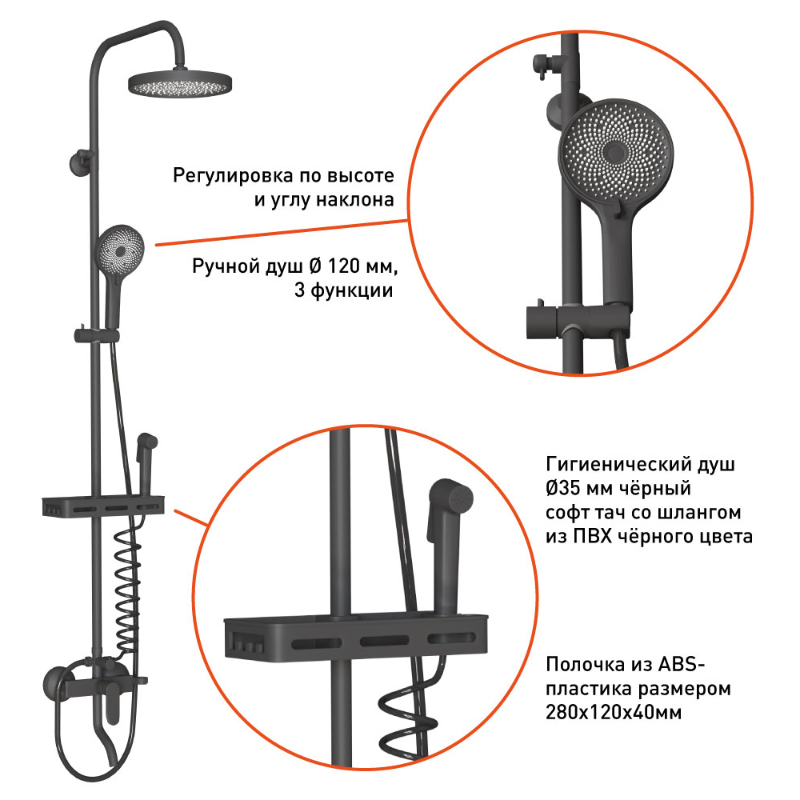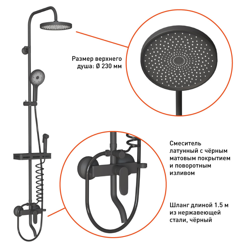 • Верхний душ круглый Ø230мм чёрный с необычной геометрией форсунок, благодаря которой осуществляется мягкий расслабляющий массажный эффект, ручной душ круглый Ø120мм 3-функциональный чёрный c чёрным шлангом 1,5м из нержавеющей стали, гигиенический душ Ø35мм чёрный soft-touch со шлангом из ПВХ чёрного цвета тип "телефон", крепежи и держатель лейки с возможностью регулировки также окрашены в чёрный цвет.