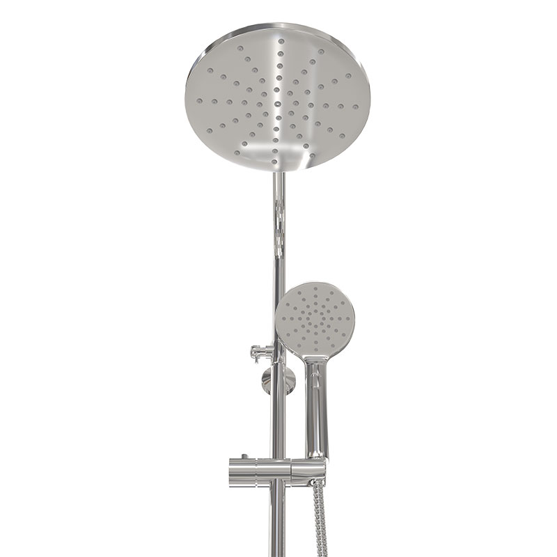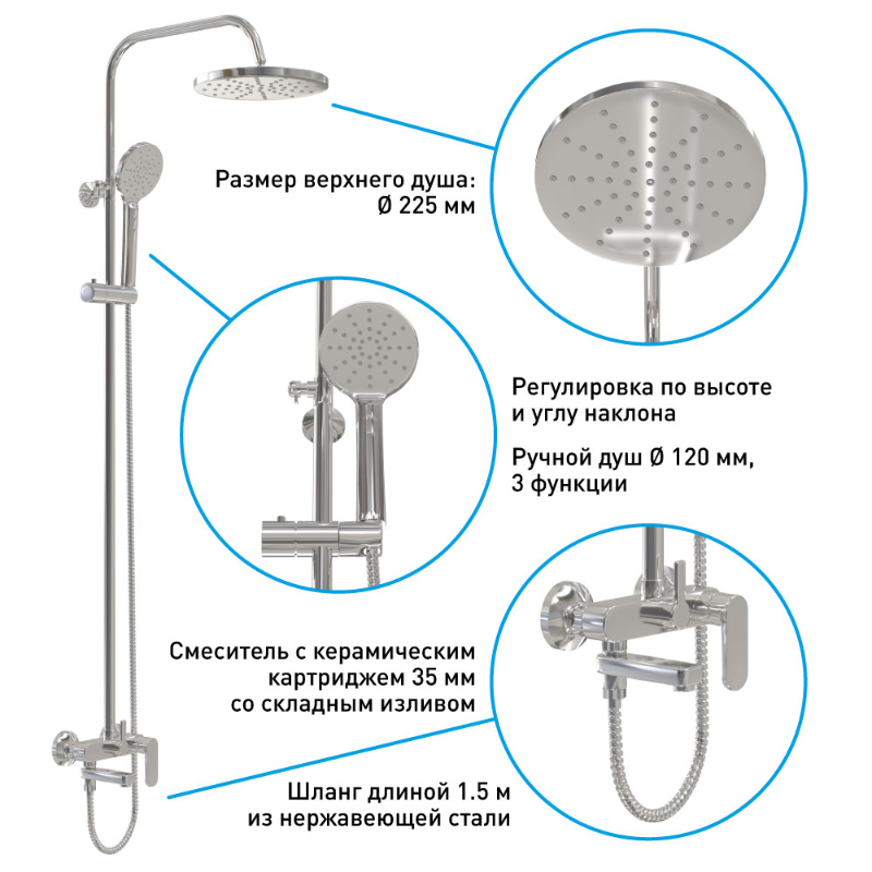 • Ручной душ круглый Ø120мм хромированный 3-функциональный, имеющий по центру форсунки-рассекатели, шланг из нержавеющей стали 1,5м, крепеж, держатель лейки хромированный с функцией регулировки по высоте и уголу наклона