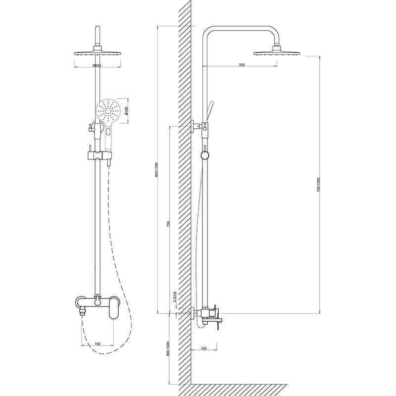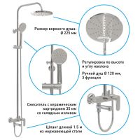 • Стойка для верхнего душа L=1100мм из нержавеющей стали 1,5мм толщиной телескопическая, позволяет регулировать душевую систему по высоте.