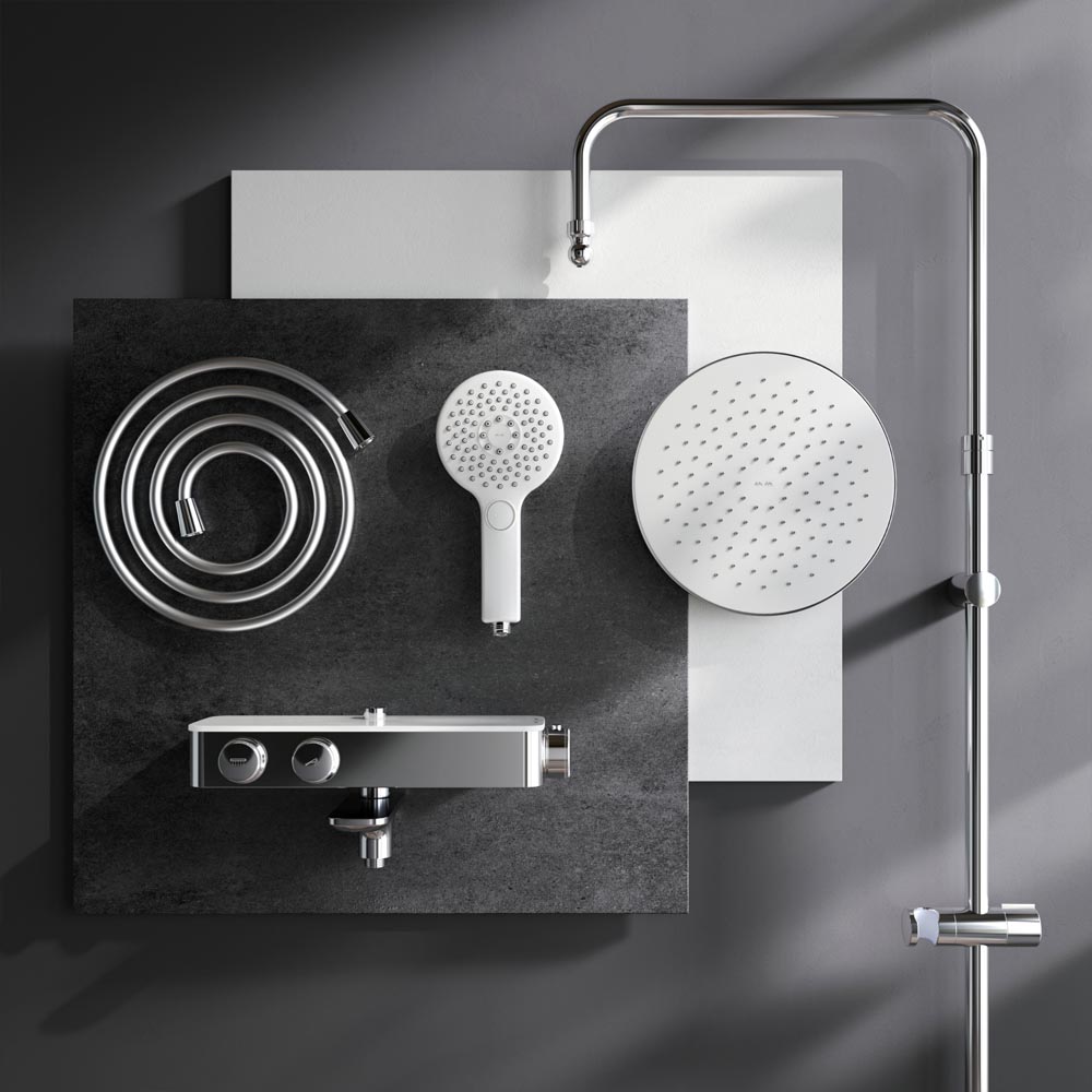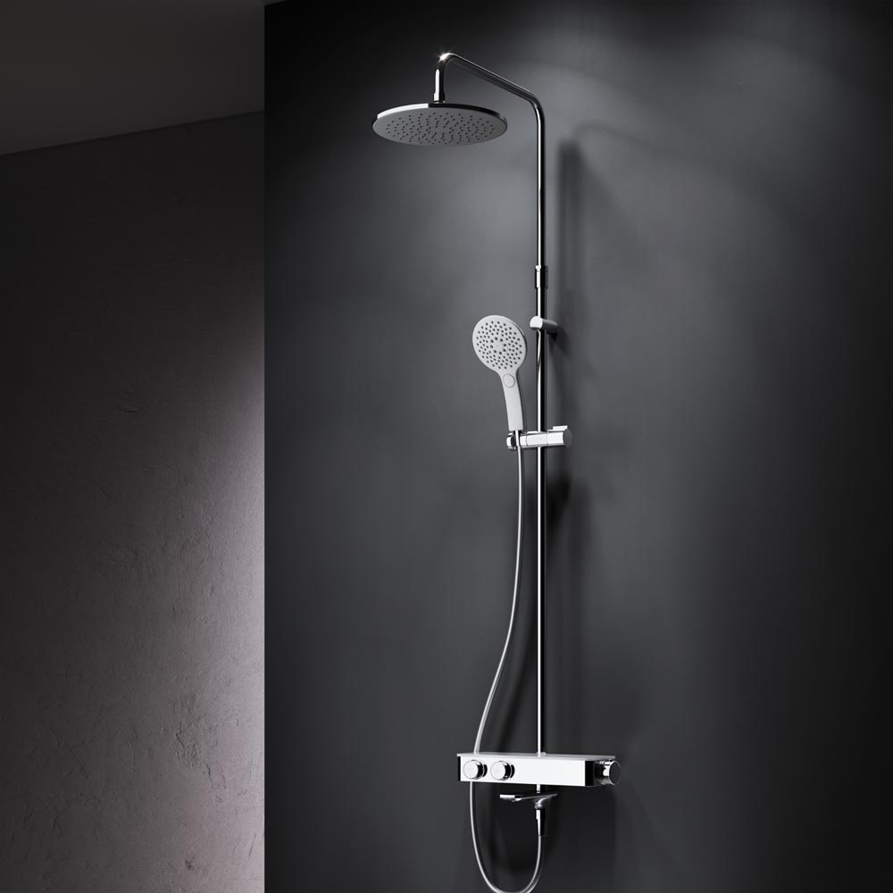 Продукт оснащен термостатическим смесителем для поддержания неизменной температуры воды. Верхняя часть смесителя выполнена из глянцевого стекла и является интегрированной полочкой для нужных мелочей при приёме душа.