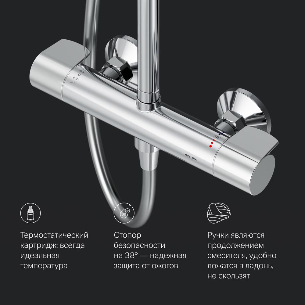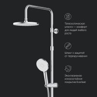 Новое прочтение культовой коллекции X-Joy. Еще больше инновационных решений для вашей ванной комнаты. Трендовые формы технологичные материалы и продуманные детали которые теперь доступны каждому. По самой привлекательной цене. Благодаря специально спроектированной эргономичной ручке вы можете управлять душевой системой даже с мыльными руками. Термостатический картридж с высокочувствительным термоэлементом и быстрой реакцией на изменения температуры или давления надежно защищает от ожога даже при внезапном отключении холодной воды. Телескопическая штанга с диапазоном регулировки 400 мм сделает процесс принятия душа удобным для людей любого роста. А благодаря увеличенным размерам тропического (228 мм) и ручного (120 мм) душей вы ощутите все преимущества использования дизайнерского продукта. Душевая система X-Joy была создана для того чтобы радовать вас каждый день.