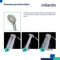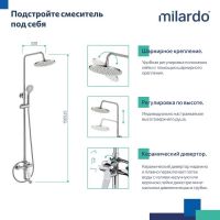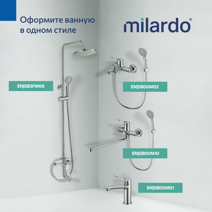 Душевая система Enjoy эстетически привлекательна и функционально проработана: выверенные пропорции между расположением аксессуаров, удобная стойка с регулируемой высотой (до 1300 мм) и излив, который легко убирается к стене. Каждая деталь продумана так, чтобы дарить свободу движений, ощущение лёгкости и комфорта каждый день. • В комплекте: тропический душ увеличенного диаметра (Ø245 мм), большая ручная лейка (ø 114 мм) с держателем, душевой шланг в оплетке из нержавеющей стали (1,5 м), эксцентрики с отражателями и крепеж. • Поворотный дивертор работает при любом давлении воды, переключая поток воды со встроенного излива на трехрежимную ручную или верхнюю лейки. • Качественный механизм смешивания воды смесителя Milardo® рассчитан на более чем 70 000 циклов работы – это не менее 15 лет эксплуатации семьей из трех человек. • Оптимальная толщина никель-хромового покрытия защищает смесители и душевые аксессуары Milardo® от образования трещин и сколов, продлевая срок их службы. • Гарантия на смеситель Milardo® – 7 лет, на картридж – 3 года, на душевые аксессуары – 1 год. • (с) Авторский текст, август 2025 г.