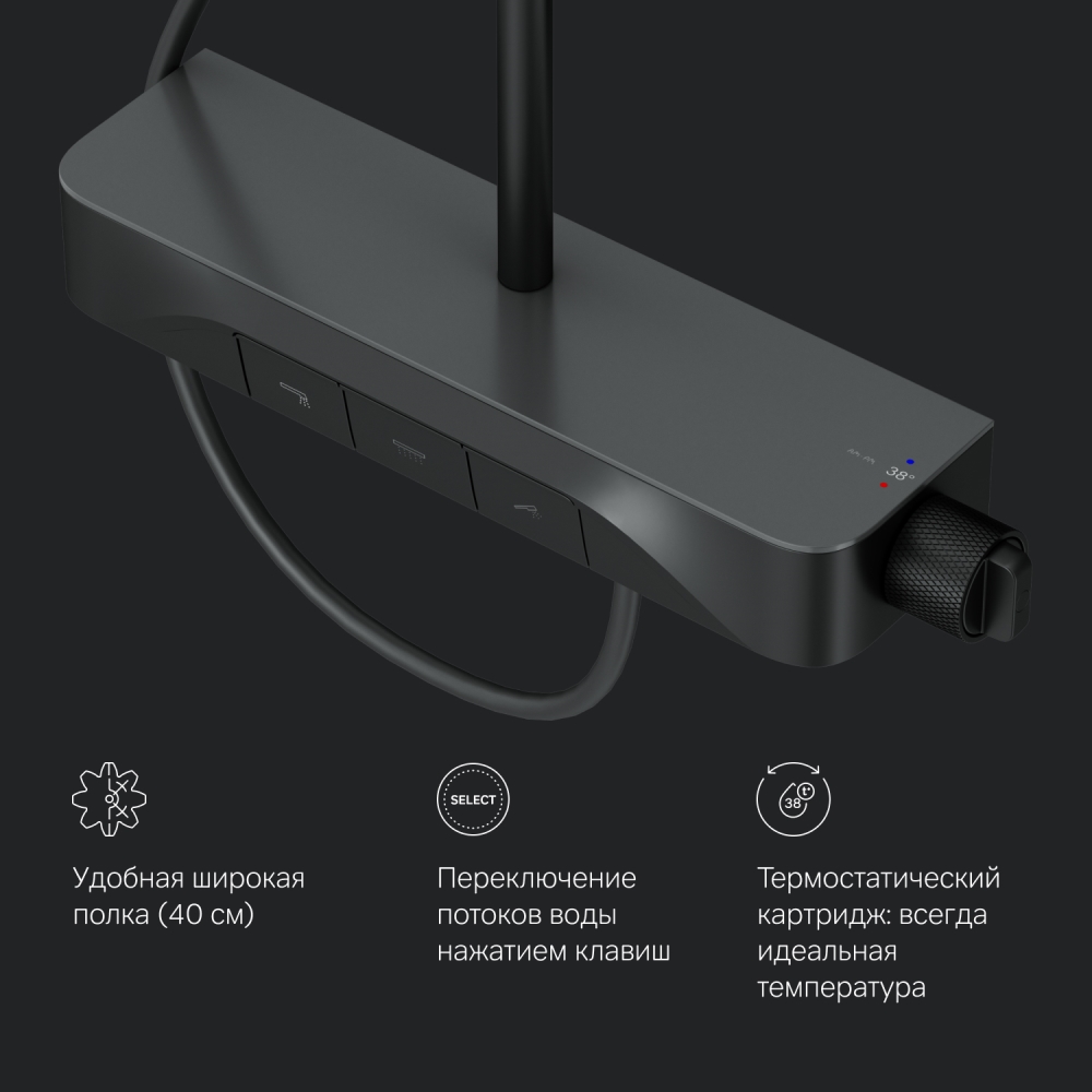 Встречайте коллекцию Func – самую функциональную коллекцию в линейке AM.PM. Наши инженеры продумали и учли каждую деталь чтобы сделать процесс использования продуктов максимально простым и комфортным для всех членов семьи. Еще больше места для хранения: смеситель выполнен в виде вместительной полочки. Внушительный размер полки (40 см.) позволяет хранить все любимые средства под рукой а эстетичный силуэт станет настоящим украшением современной ванной комнаты. Интуитивно понятное управление: всего одна удобная ручка для настройки температуры и потока воды. Благодаря специально спроектированной эргономичной ручке вы можете управлять душевой системой даже с мыльными руками. Переключение потоков воды осуществляется нажатием клавиши. Продуманные детали для вашего удобства: телескопическая штанга регулируется по высоте обеспечивая комфорт для людей любого роста. Трендовая прямоугольная форма и увеличенный размер тропического душа подарят вам ощущения настоящего домашнего SPA.