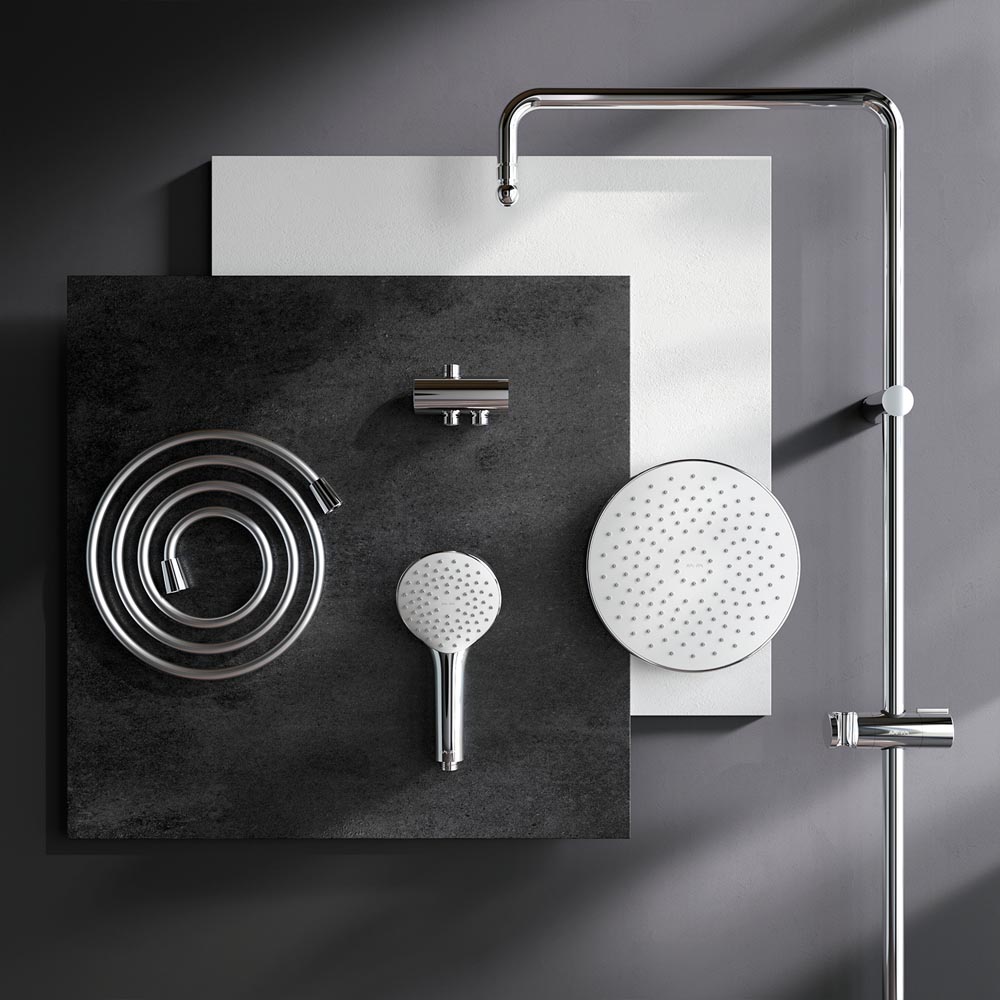 Тотальный дизайн в действии: все детали душевой системы AM.PM Gem F0790000 - от пропорций ручного и верхнего душей до рисунка расположения форсунок на лейках – подчинены единой дизайн-концепции коллекции Gem.