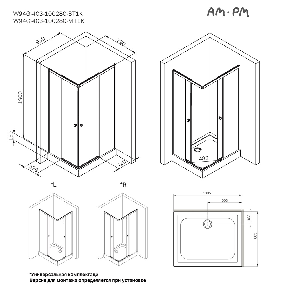 Душевое ограждение AM.PM X-Joy 100x80 см, без поддона, профиль матовый хром, форма прямоугольная W94G-403-100280-MТ1К