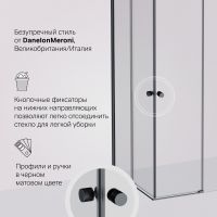 Надежные комплектующие безупречный стиль и простой монтаж – все это про душевые ограждения AM.PM X-Joy. Тонкий контур окантовки невесомый силуэт и отсутствие нижних профилей – продуманная функциональность от дизайн-бюро DanelonMeroni (Великобритания / Италия). Прочная конструкция: верхние ролики увеличенного диаметра и нижние направляющие с надежной системой захвата стекла для плавного хода двери. Кнопочные фиксаторы на нижних направляющих позволяют легко отсоединить стекло для легкой уборки. Безопасное закаленное стекло: толщина дверей – 6 мм стенок – 4 мм. Беспрецедентно стойкое покрытие: надежный алюминиевый профиль окрашен методом порошкового нанесения при высокой температуре благодаря чему краска ложится на профиль идеально ровно а также проникает в структуру самого металла. Яркий акцент в вашем интерьере: ультрамодные ручки с паттерном станут настоящим украшением ванной комнаты. Матовые профили и ручки выполненные в черном цвете предотвращают появление отпечатков пальцев рук и сохраняют поверхность чистой намного дольше. Высота ограждения 1900 мм с заботой о людях высокого роста.