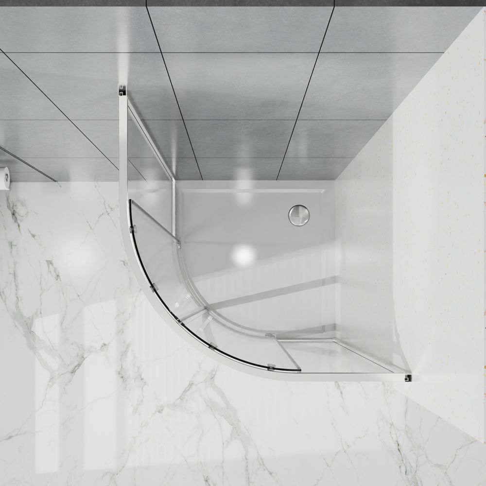 Радиусный Душевой Уголок 1/4 круга ВХОД С УГЛА, с двумя раздвижными дверьми, на двойных роликах с нержавеющими подшипниками. Ручки выполнены из латуни в цвет профиля. Все стекла имеют толщину 6 мм. Профиль выполнен из анодированного алюминия.