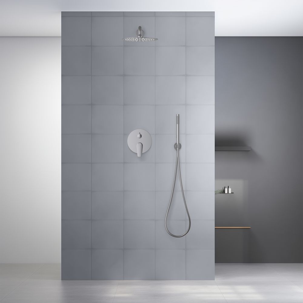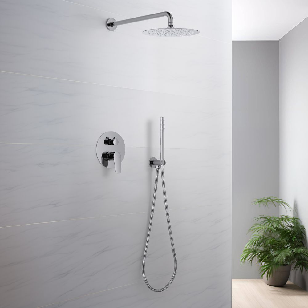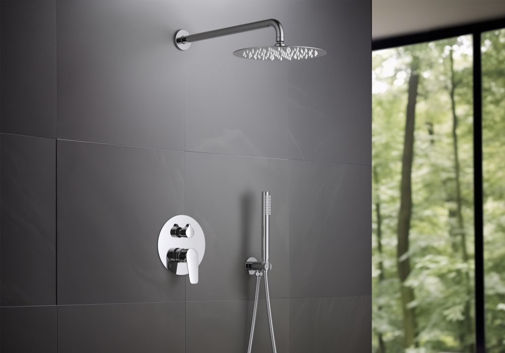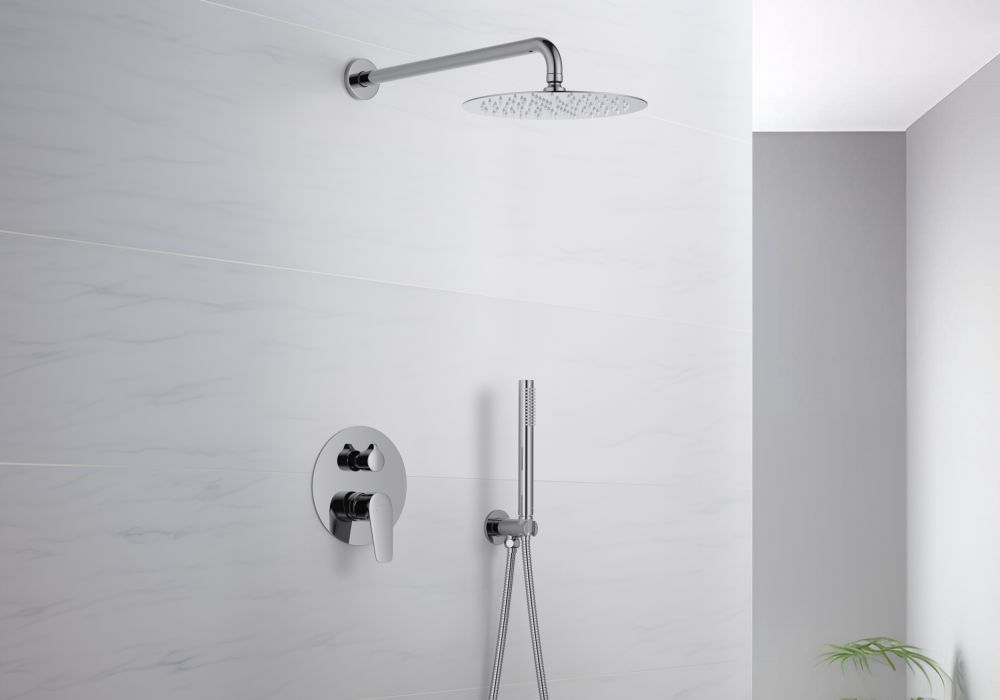 смеситель из латуни на 2 потребителя; картридж citec 35 мм, испания; декоративная пластина 3мм из нерж.; кронштейн для верхнего душа 400мм из нерж.; верхний душ 250х2мм из нерж.; душевой шланг 1,5м из нерж.; латунный держатель ручного душа; ручной душ из латуни на 1 режим струи; упакован в коробку, пленку из вспененного пвх
