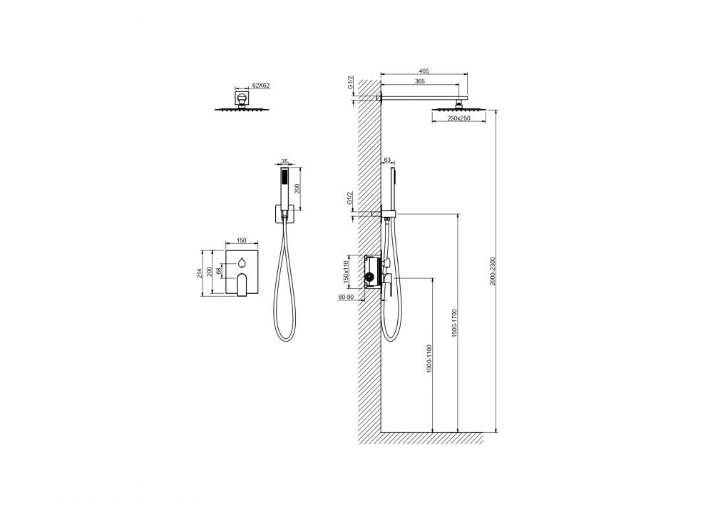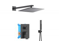 смеситель из латуни на 2 потребителя; картридж citec 35 мм, испания; декоративная пластина 3мм из нерж.; кронштейн для верхнего душа 400мм из нерж.; верхний душ 250х250х2мм из нерж.; ручной душ из латуни на 1 режим струи; душевой шланг 1,5м из нерж. с защитой от перекручивания; латунный держатель ручного душа; упакован в коробку, пленку из вспененного пвх